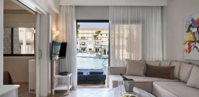 40-45 м2, вид на бассейн, спальня, гостиная, двуспальная кровать и диваны, балкон или терраса. Количество гостей: 4Premium One Bedroom Suite Pool View/ Премиум сьют