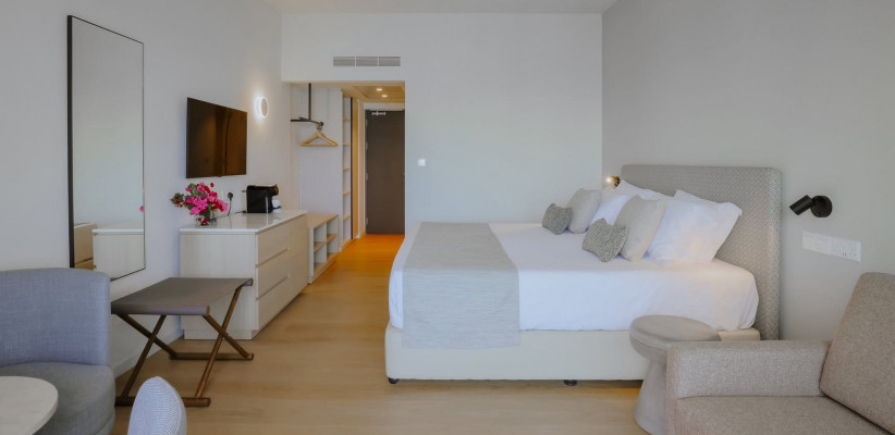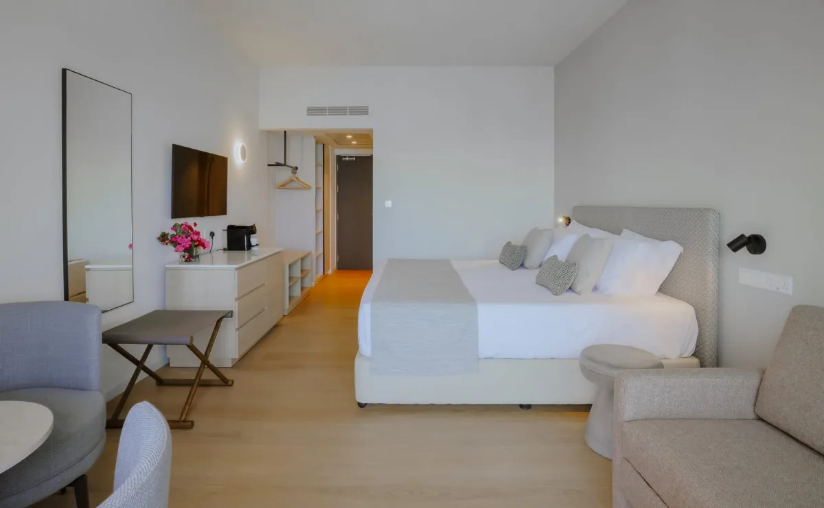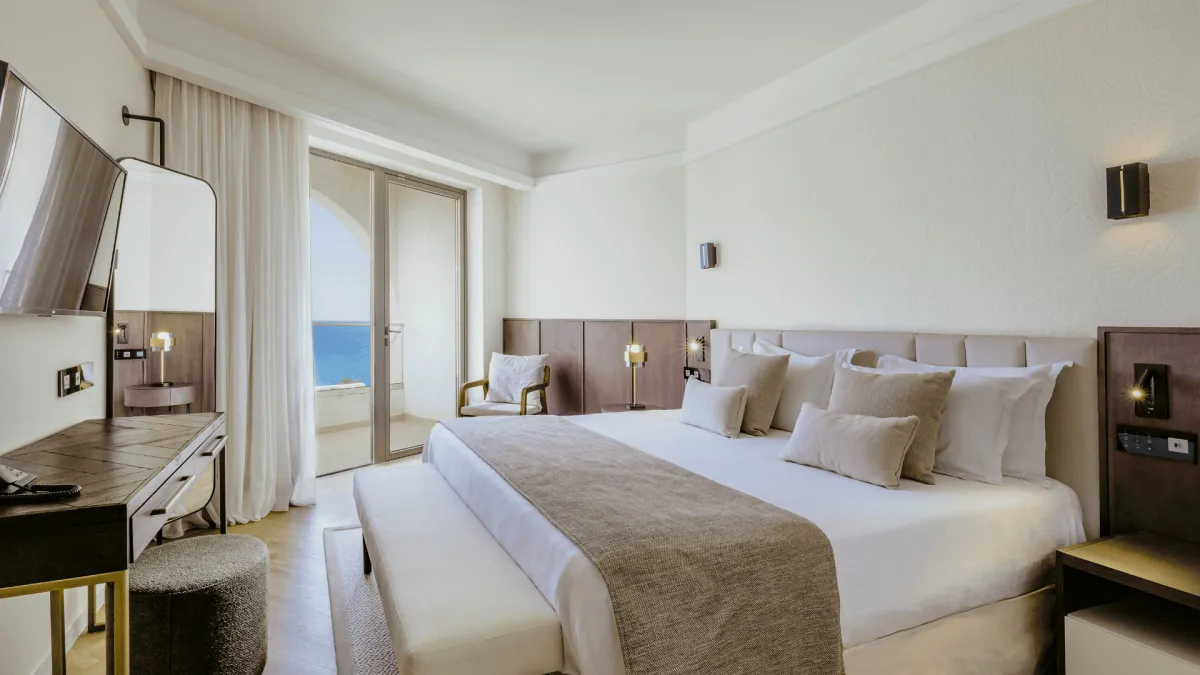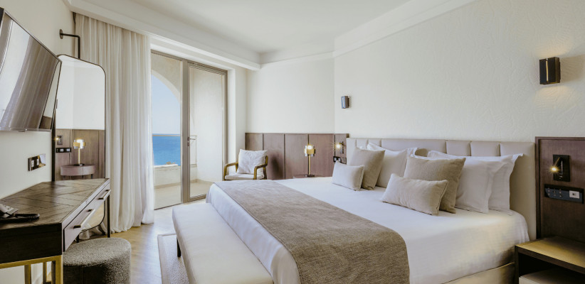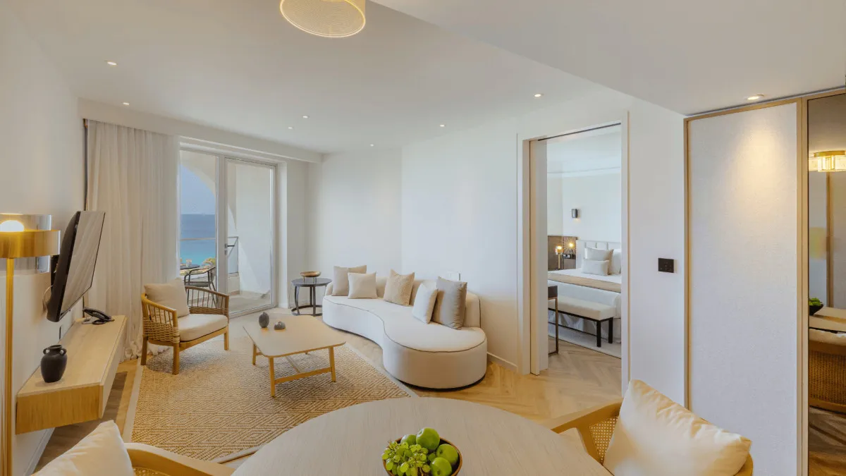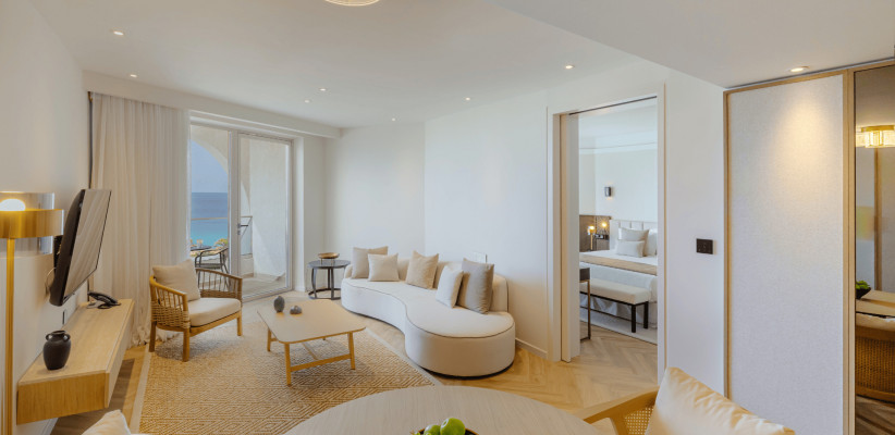 42 м2, два балкона с панорамным видом на море, спальня с двуспальной кроватью размера king-size, отдельная гостиная с диваном, рабочее место.