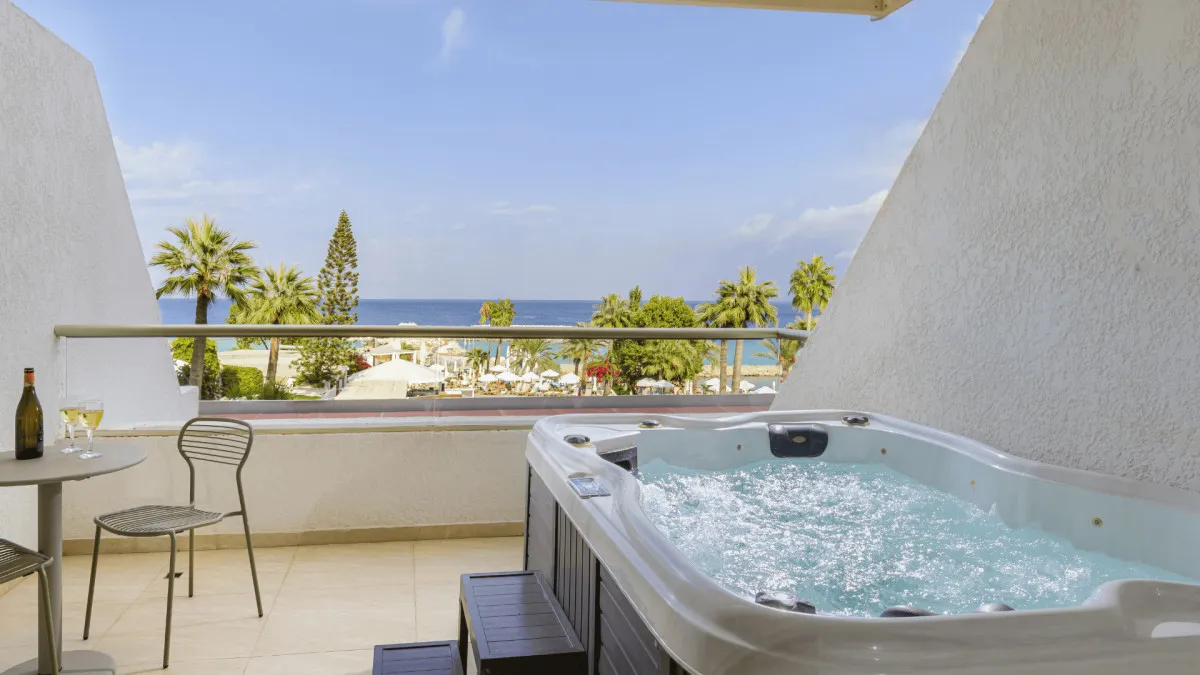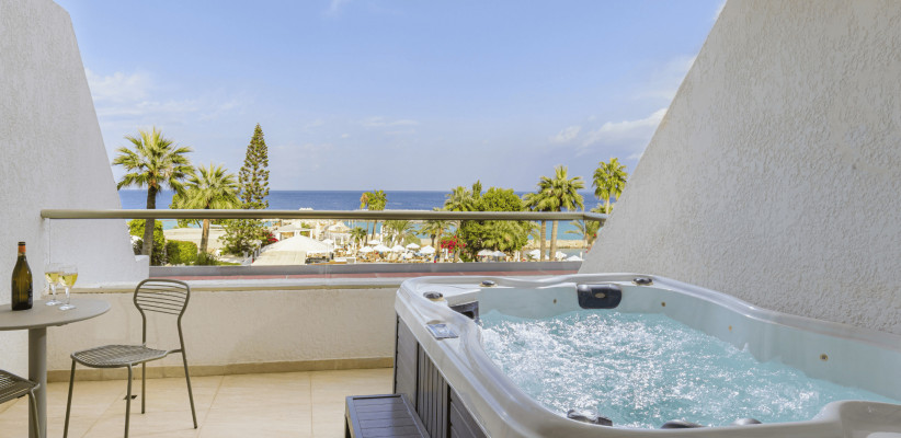 27-28 м2, с видом на море и бассейн, спальня с двуспальной кроватью размера king-size, рабочее место, собственная джакузи на открытом воздухе.Grand Suite/ Гранд сюит