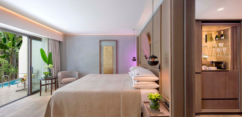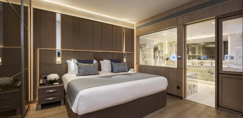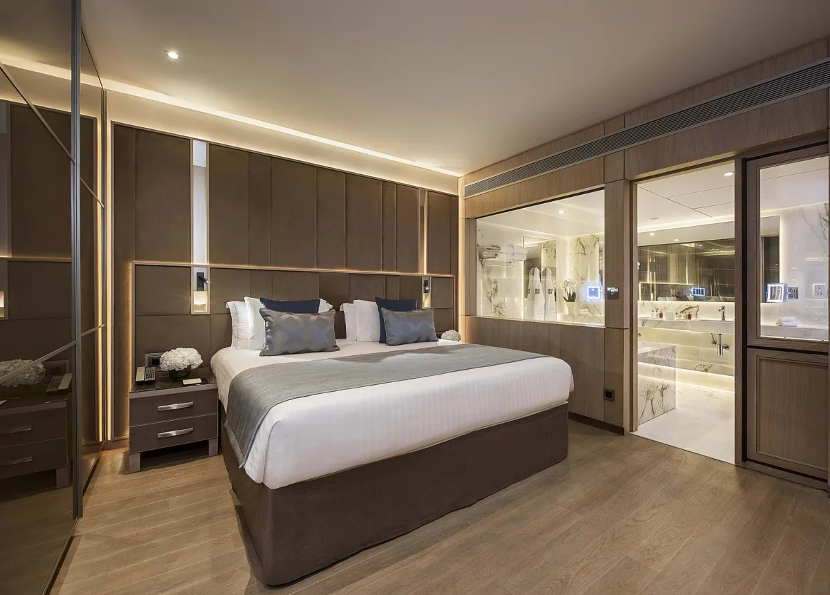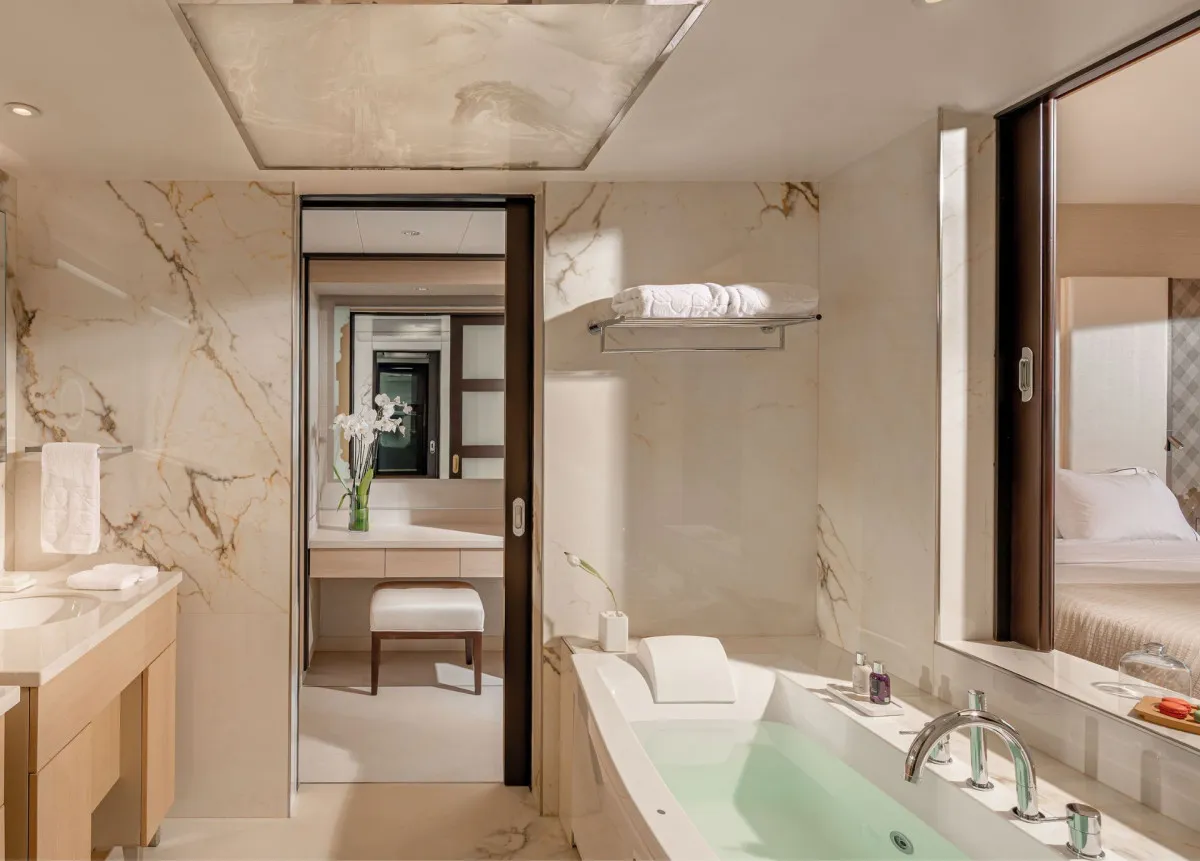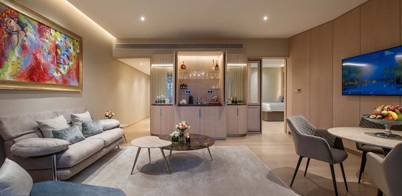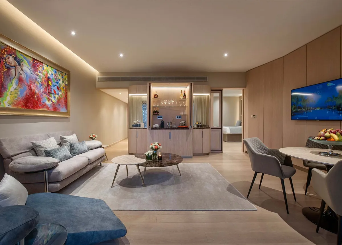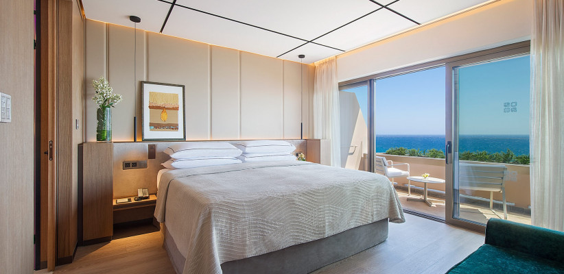 54 м2, балкон с видом на море, спальня с двуспальной кроватью размера king-size, отдельная гостиная зона, рабочее место, ванная комната отделаная мрамором. Максимальное количество гостей: 2 или 3.One Bedroom Luxury Suite/ Однокомнатный сюит