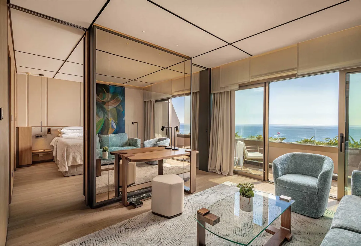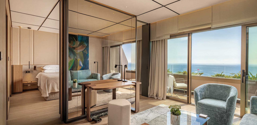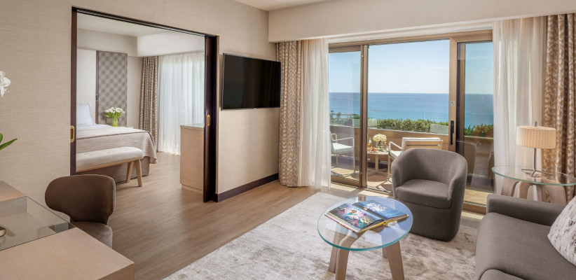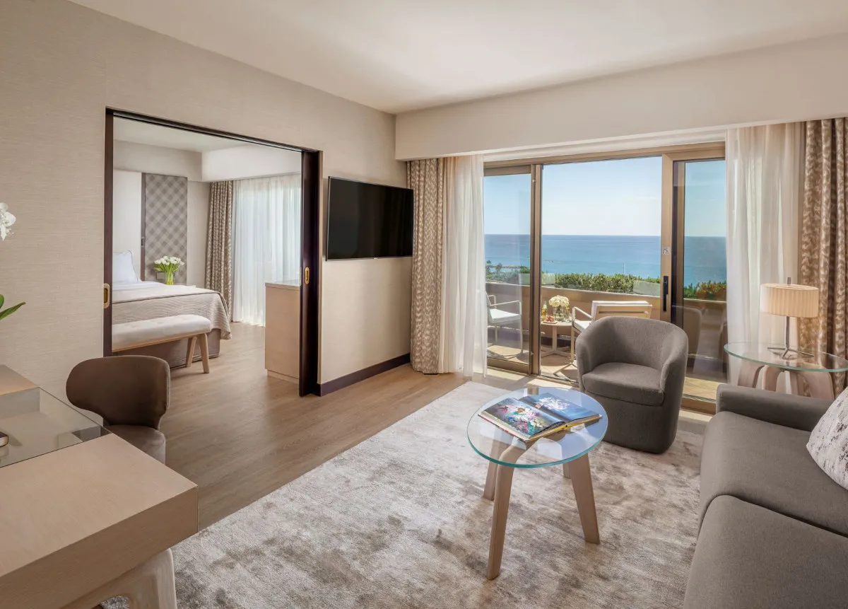 77 м2, мебелированный балкон с панорамным видом на море, спальня с двуспальной кроватью размера king-size, отдельная гостиная, обеденная зона, рабочее место. Максимальное количество гостей: 2.Two Bedroom Family Suite/ Двухкомнатный семейный сюит