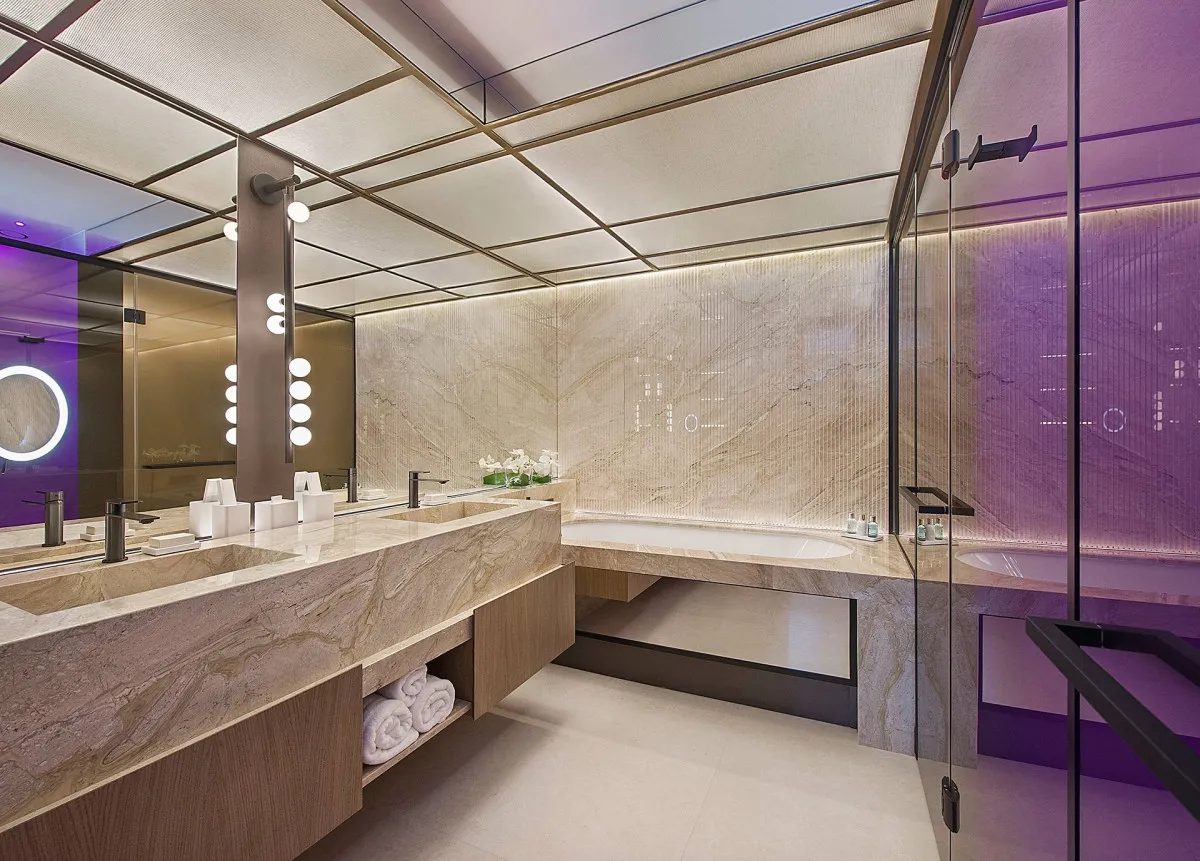 90 м2, спальня с двуспальной кроватью размера king-size, две односпальные кровати или две двуспальные кровати, отдельная гостиная, обеденная зона, рабочее место, две ванные комнаты. Максимальное количество гостей: 2 или 5.