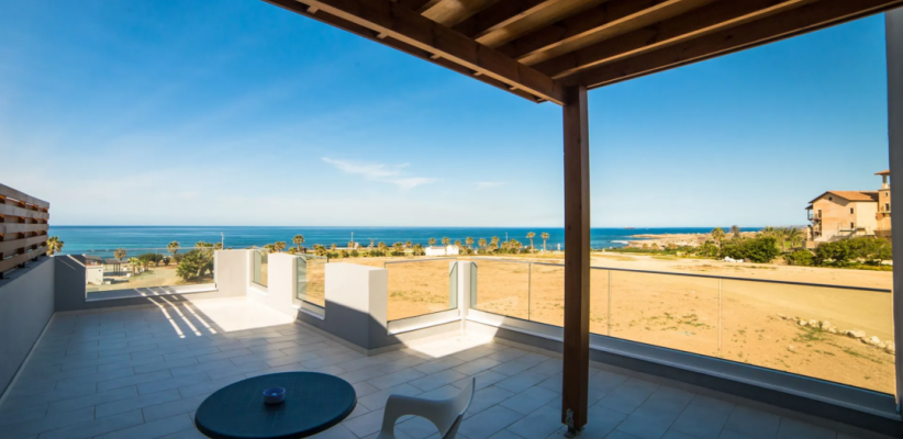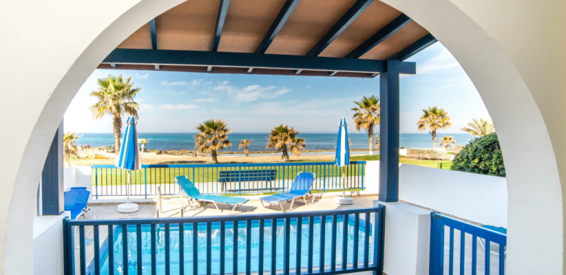 три спальни, шесть односпальных кроватей, отдельная гостиная с диваном-кроватью, мини-кухня, меблированный балкон или терраса с видом на море, частный бассейн. Количество гостей: 6