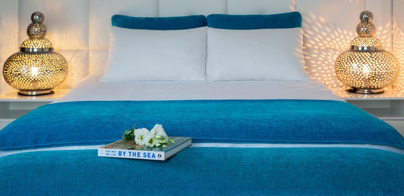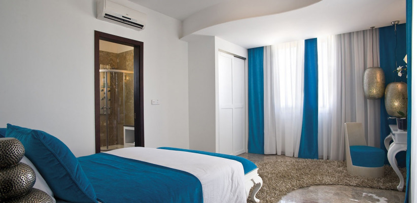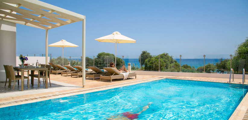 180 м2, вид на море, два этажа, четыре спальни. Просторная гостиная и столовая, полностью оборудованная кухня. Каждая вилла имеет собственный частный бассейн и сад. На первом этаже расположены спальня с собственной ванной комнатой с душем, гостиная, зона отдыха, кухня и туалет. На втором этаже находятся главная спальня с собственной ванной комнатой с душем и балконом, который делится со спальней с двумя односпальными кроватями, еще две спальни с раздельными кроватями, балкон и ванная комната с джакузи. Все виллы имеют веранду с фронтальным видом на море, оборудованную обеденным столом в саду, шезлонгами и зонтами. Количество гостей: 8