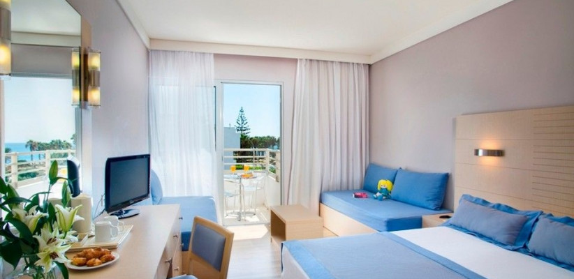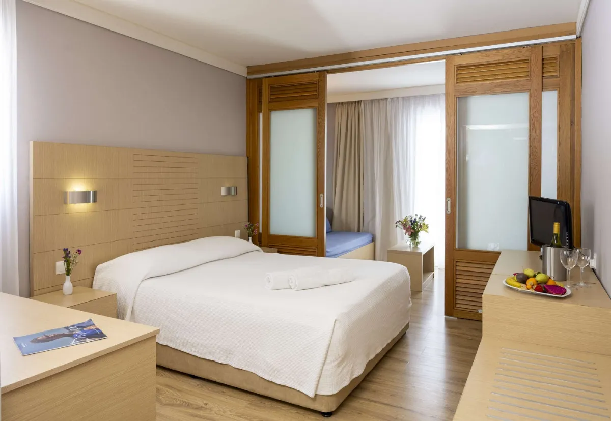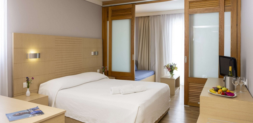 25 м2, частичный вид на море или на территорию, двуспальная кровать и два дивана-кровати, балкон или терраса. Количество гостей: 4Family room with sliding door/ Семейный номер с раздвижной дверью