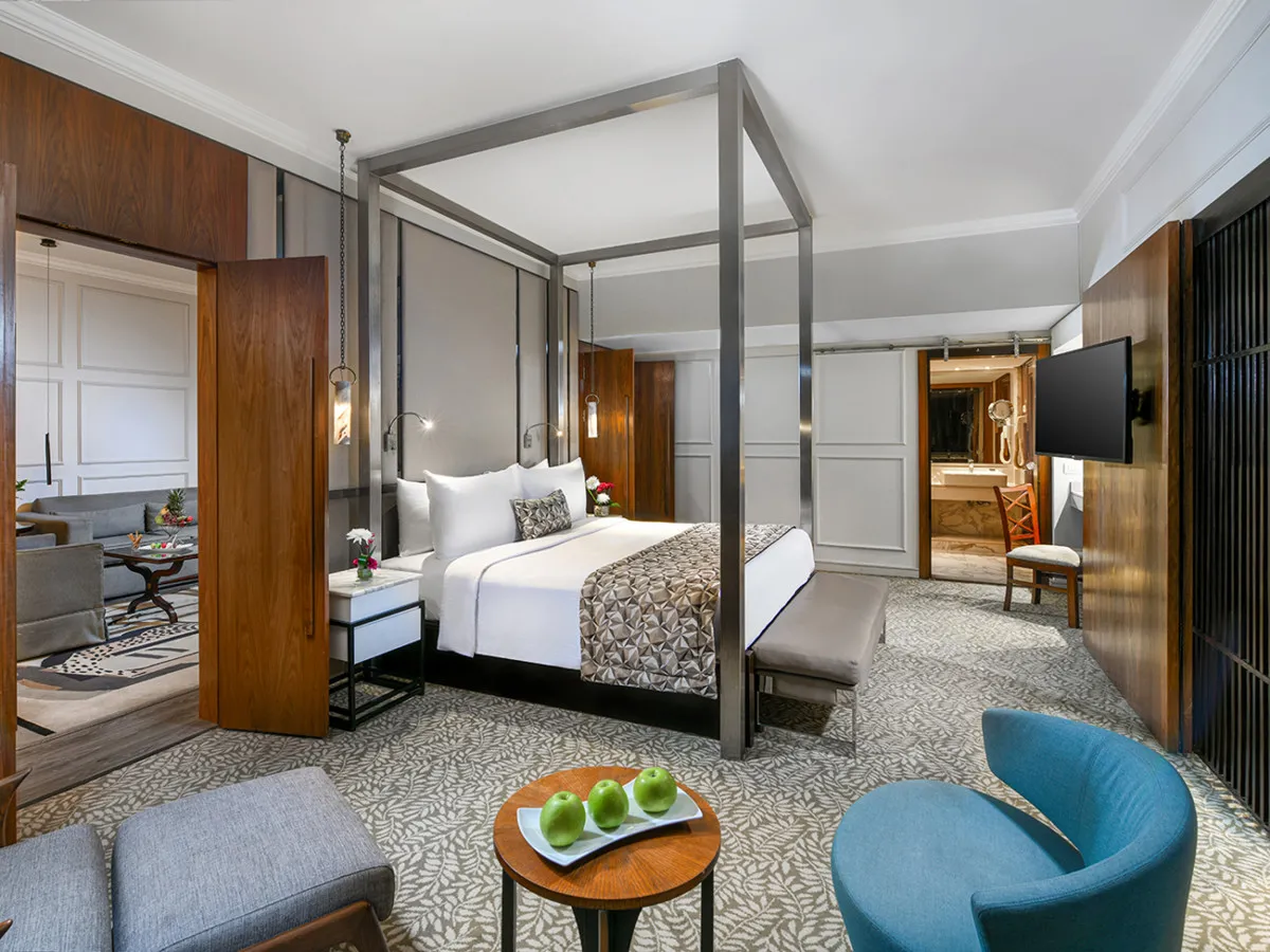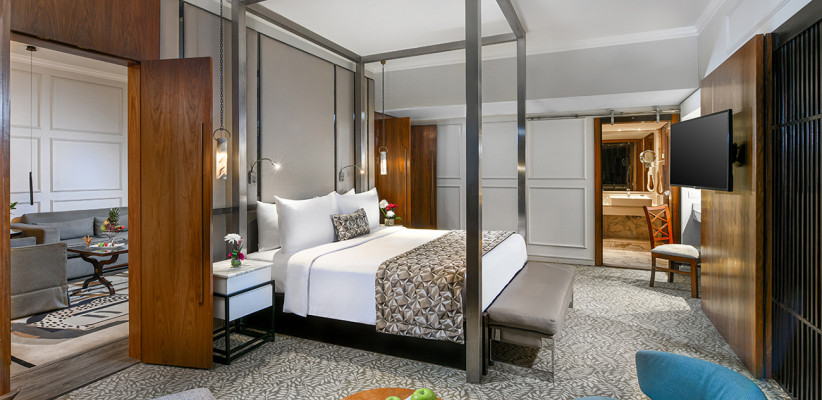 панорамный балкон с видом на бассейн, двуспальная кровать, гостиная зона, диван-кровать, гидромассажная ванна. Количество гостей: до 3Deluxe Suite (Главное здание)
