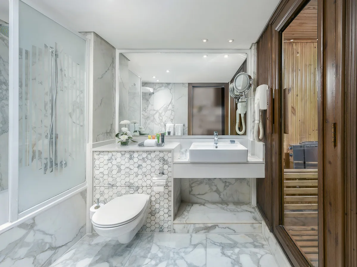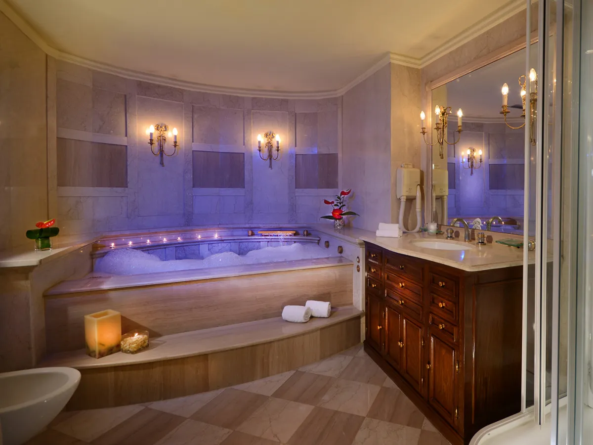 двуспальная кровать, гостиная, ванна, душевая кабина и биде, сауна и джакузи. Количество гостей: до 3Royal Suite (Главное здание)