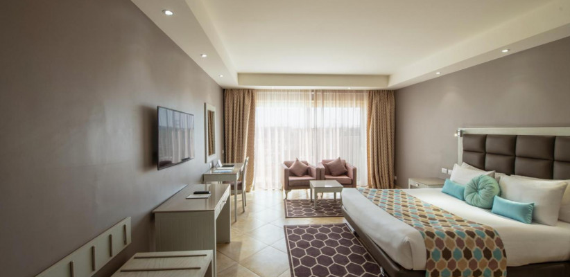 54 м2, терраса с выходом к бассейну для детей и взрослых, частичный вид на море или вид на бассейн, двуспальная кровать, гостиная с двумя раскладными диванами, гардеробExecutive Jacuzzi Suite