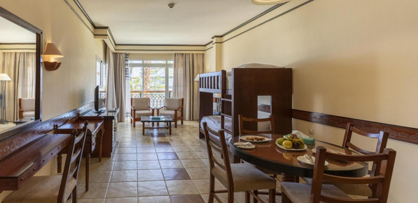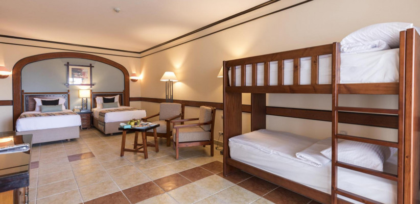 43 м2, вид на сад/ горы/ бассейн/ частичный вид на море, спальня с кроватью размера king-size или двумя односпальными кроватями и двухъярусной кроватью, гостиная зонаMega Family Room (Bunk Bed)