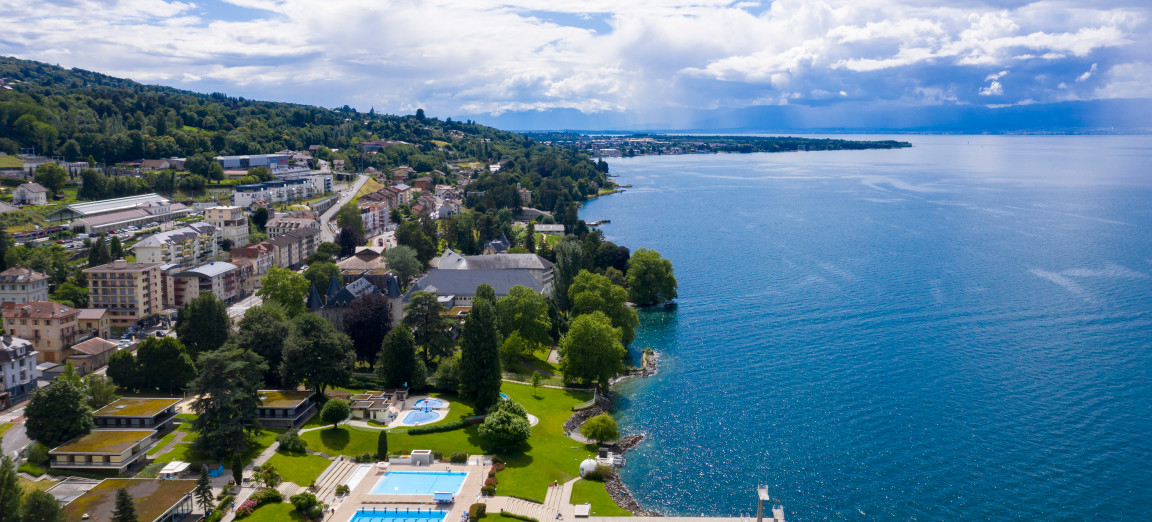 Эвиан-Ле-Бен расположен на южном берегу Женевского озера, у подножия горного массива Шабле (Савойские Альпы).