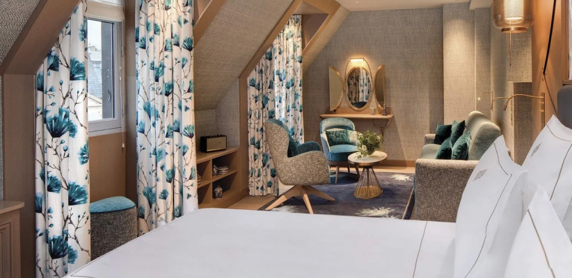 36-40 м2, номера, оформленные исключительно в золотистых тонах, оборудованы двуспальной кроватью (или двумя односпальными кроватями) и зоной отдыха (неразделенной, с диваном-кроватью), количество гостей: 4Junior Suite Eiffel