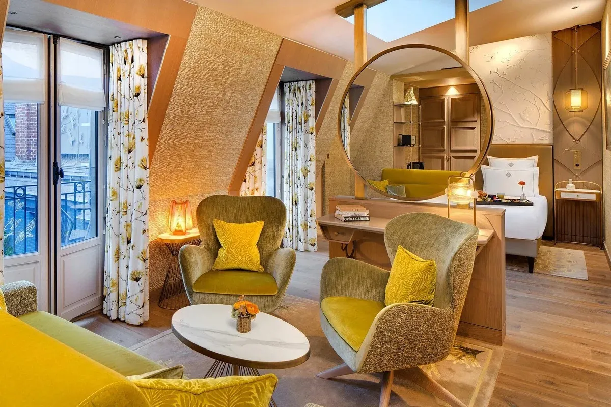 36-40 м2, спальня с двуспальной или двумя односпальными кроватями, два кресла с кофейным столиком, гостиная зона с диваном-кроватью, номера оформлены в золотистых оттенках. Максимальное количество гостей: 4.Junior Suite Eiffel