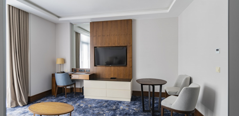 38 м2, балкон, спальня с королевской двуспальной кроватью, гостиная с диваном-кроватью. Гости этой категории могут пользоваться собственной гостиной на крыше с каминомExecutive Suite/ Представительский люкс