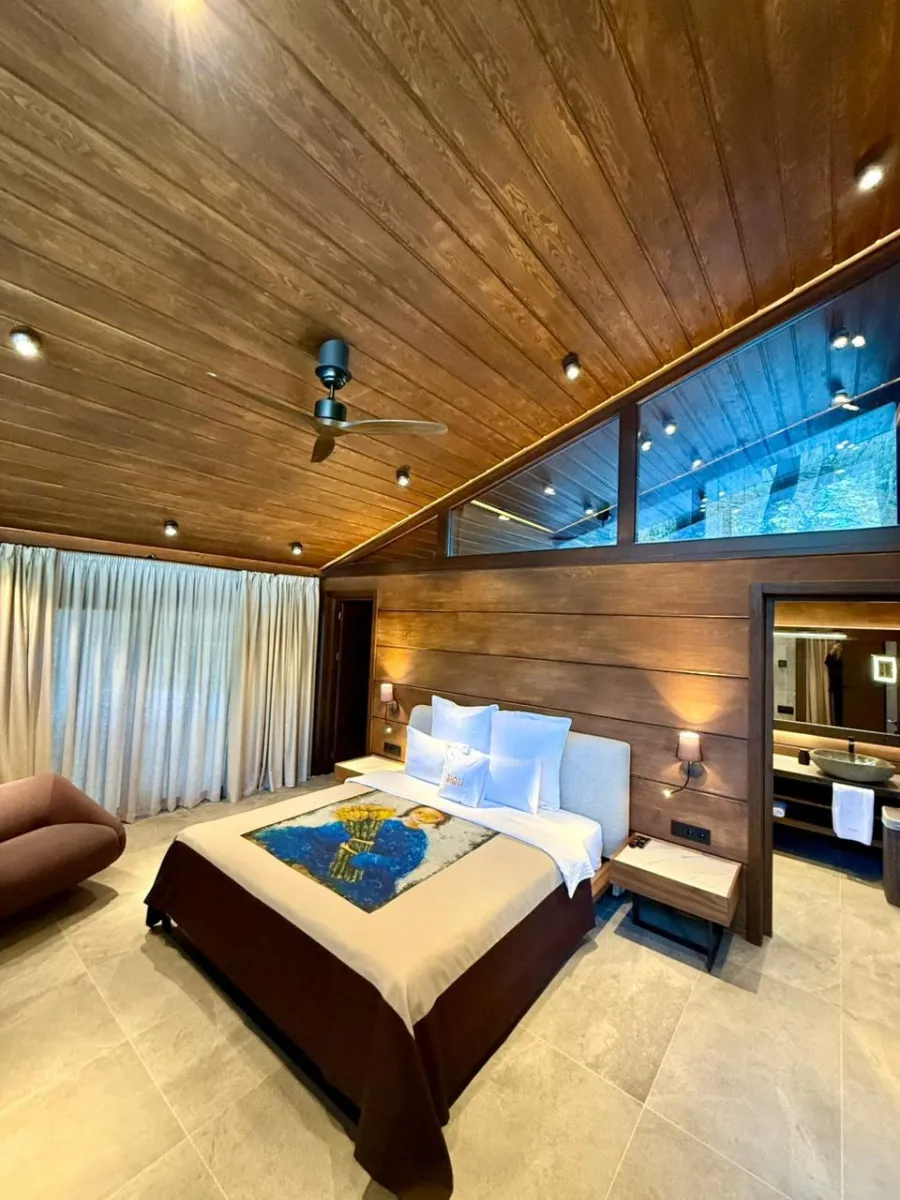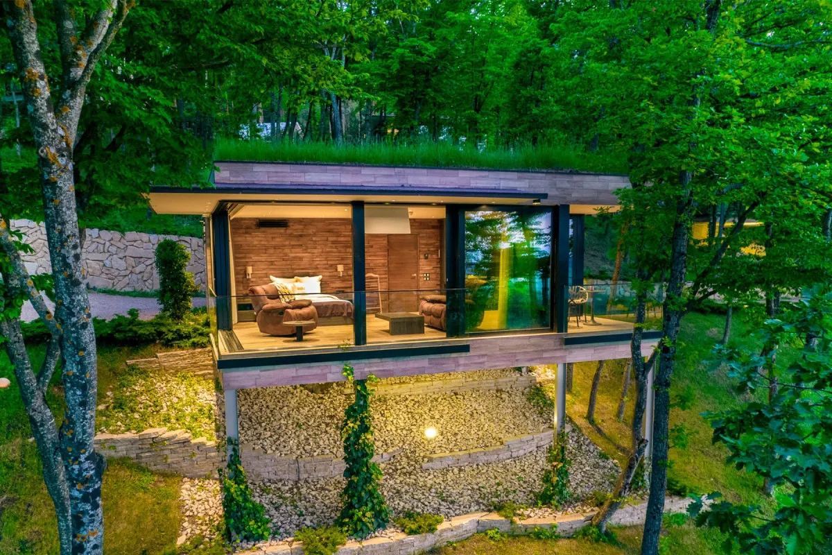 двухэтажный коттедж в лесной зоне с потрясающим видом на частное озеро, одна спальня, гостиная, терраса, джакузи на открытом воздухе
