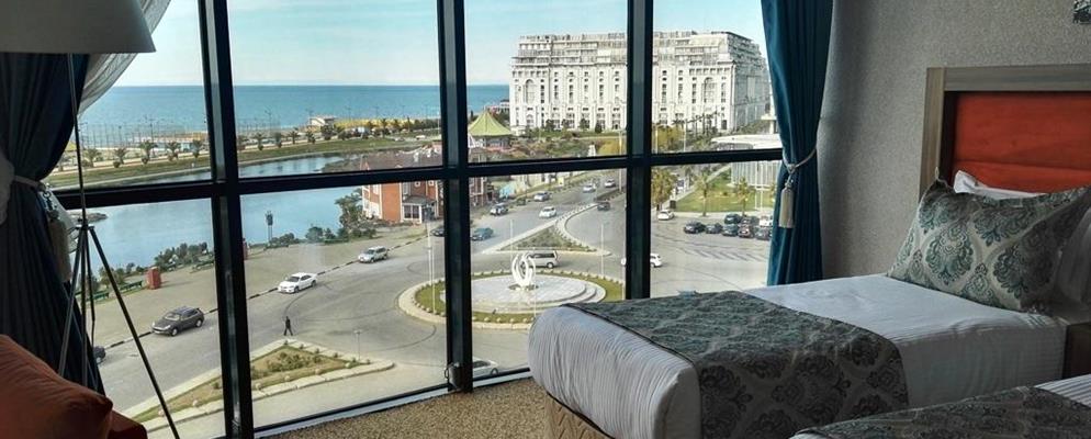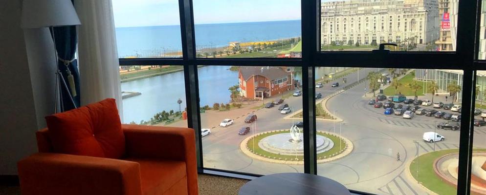 5-звездочный отель в Батуми располагается на первой пляжной линии, но отсутствуют дополнительные детали о его удобствах и расстоянии до аэропорта.