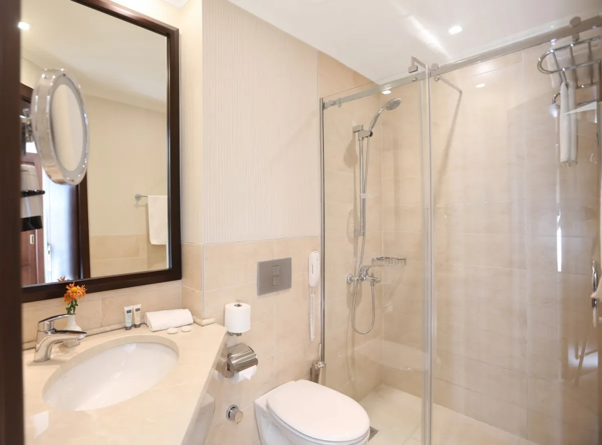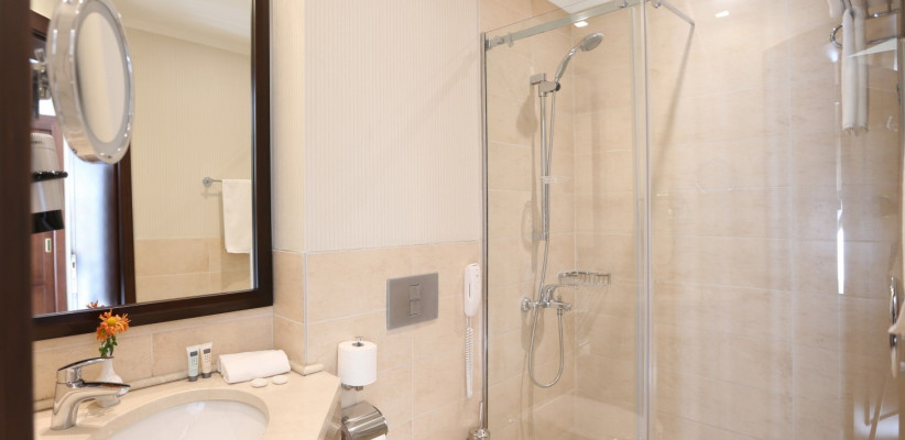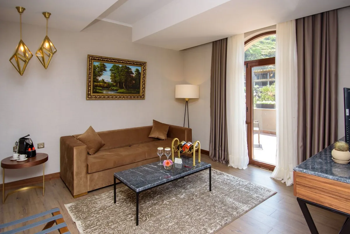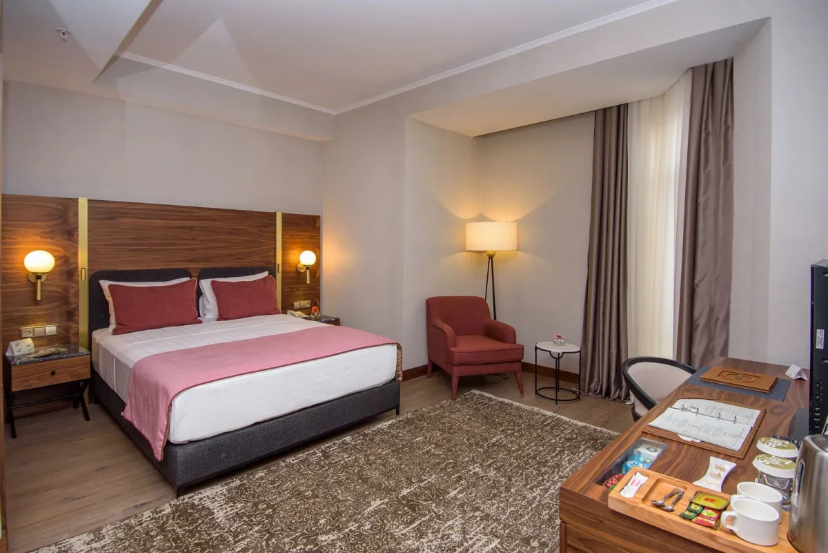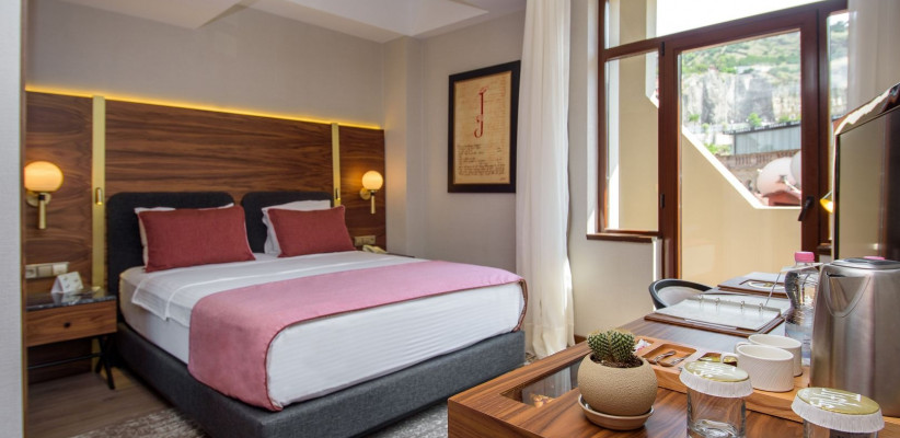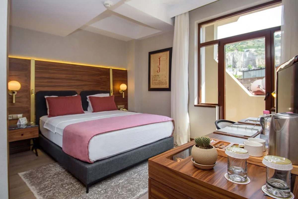 Номерной фонд отеля составляет 43 элегантно оформленных, просторных комнат с потрясающими видами на набережную, Серные бани, церковь и мост «Метехи», крепость «Нарикалу» и плащадь «Мейдан».Deluxe Room