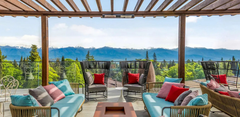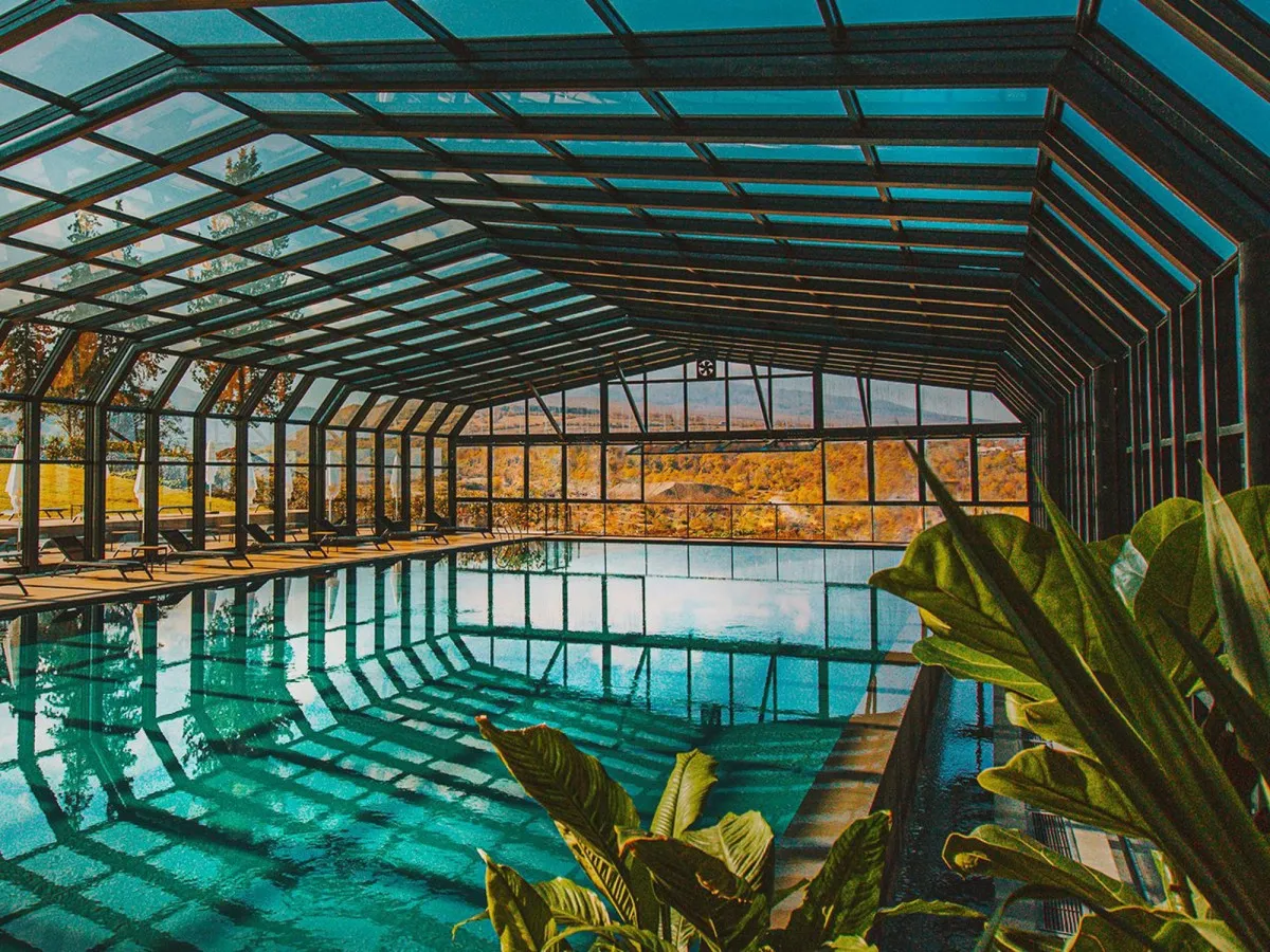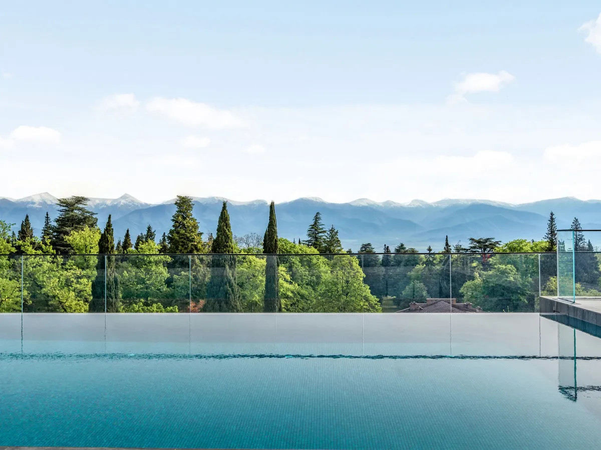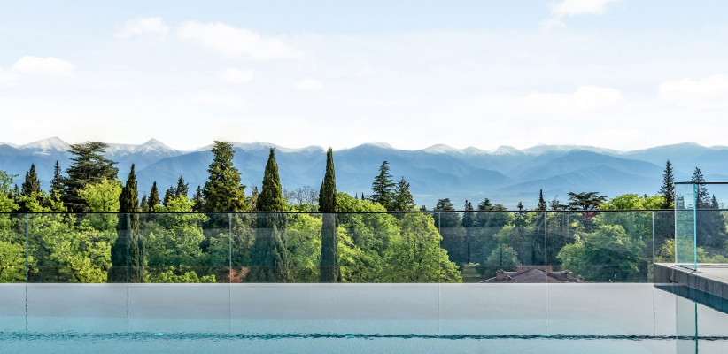 - Панорамный инфинити-бассейн на крыше с подогревом и видом на Кавказские горы.