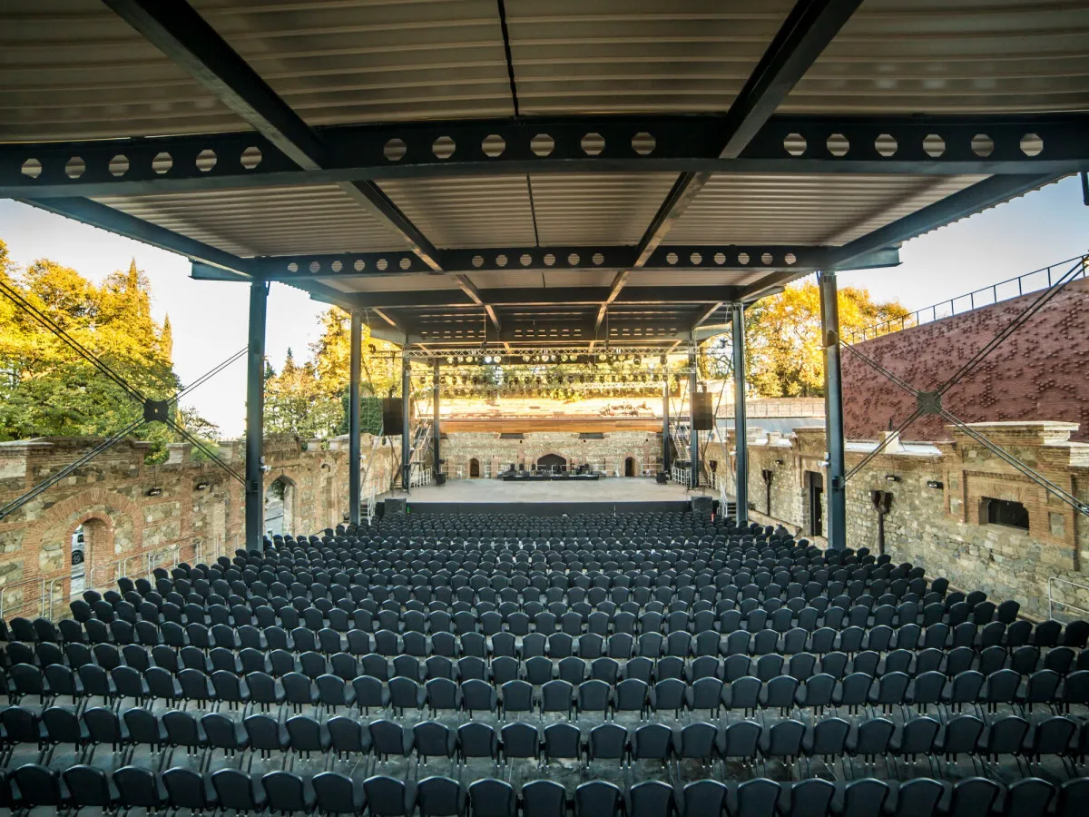 - Впечатляющий открытый амфитеатр на 1200 мест, где проводится международный музыкальный фестиваль в Цинандали.