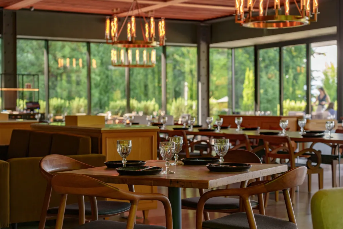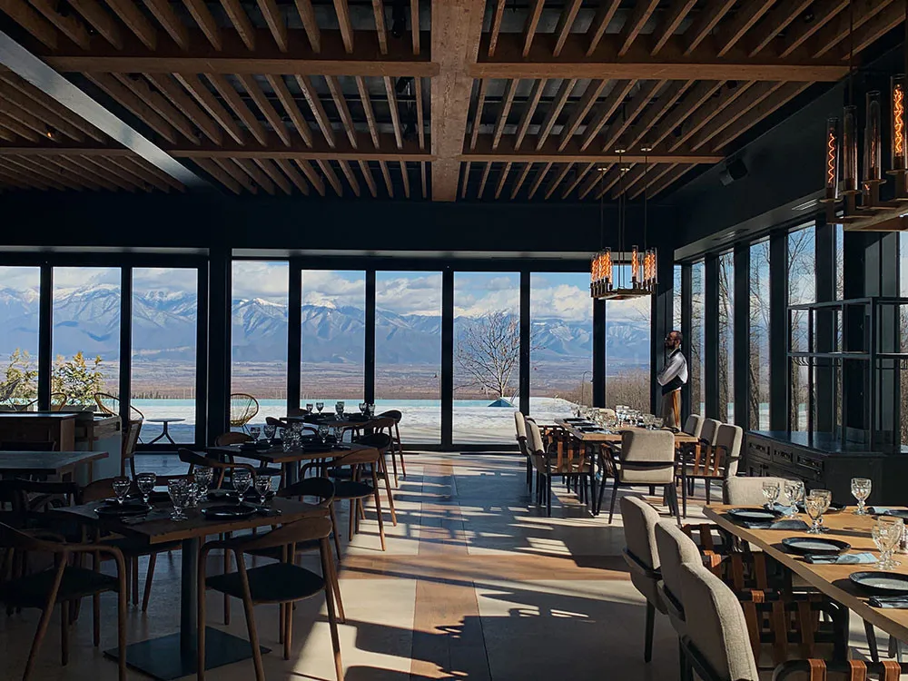- Стильный ресторан с панорамным остеклением и современной интерпретацией кахетинской кухни по принципу «от фермы до стола».