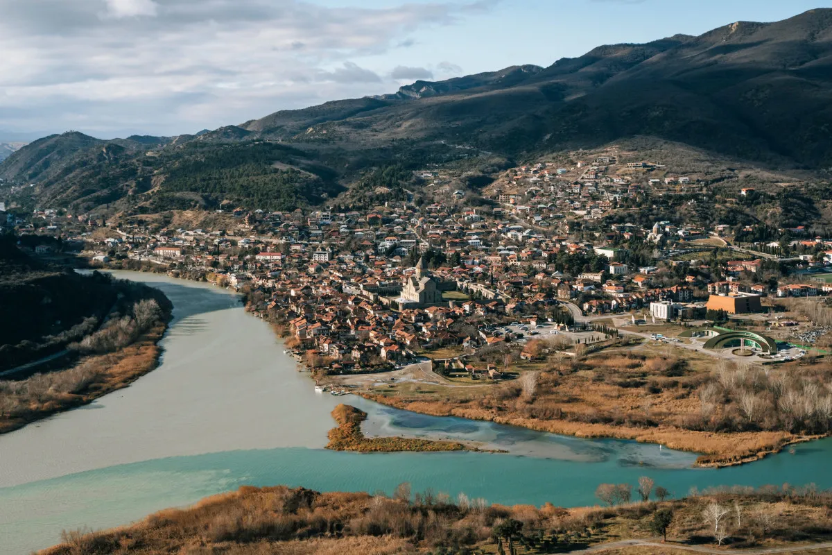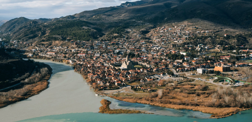 Монастырский храм Джвари V века, откуда открывается обширная панорама Мцхеты. Он стоит у самого края высокого утеса, гармонируя с окружающей его живописной природой. Внизу шумят Кура и Арагви – две самые известные реки в Грузии.