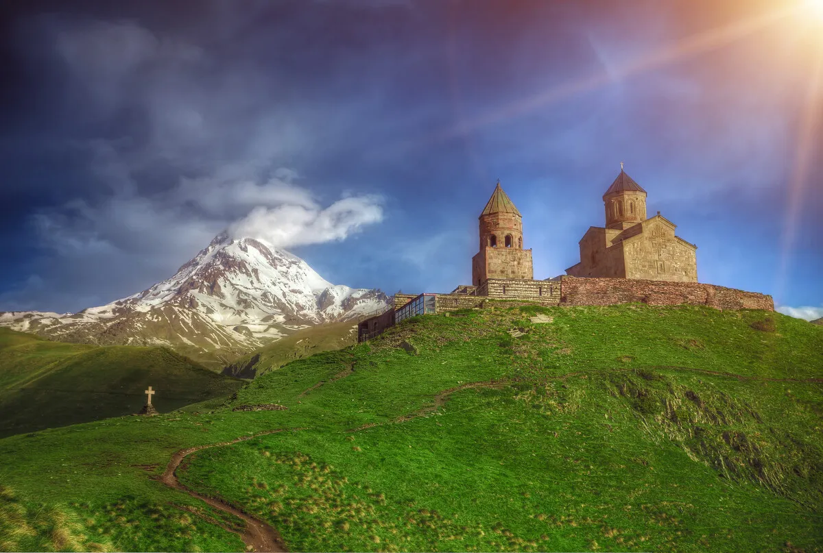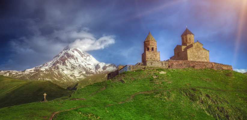 Казбек. Подъем на джипе на смотровую площадку на высоте 2170 м у старинного храма Святой Троицы в Гергети с видом на долину реки Терек, которую описывали Лермонтов и Грибоедов. Казбек – потухший вулкан, покрытый вечными снегами. Это один из самых высоких пиков Кавказа, хотя и ниже Эльбруса, с высотой 5047 м над уровнем моря.