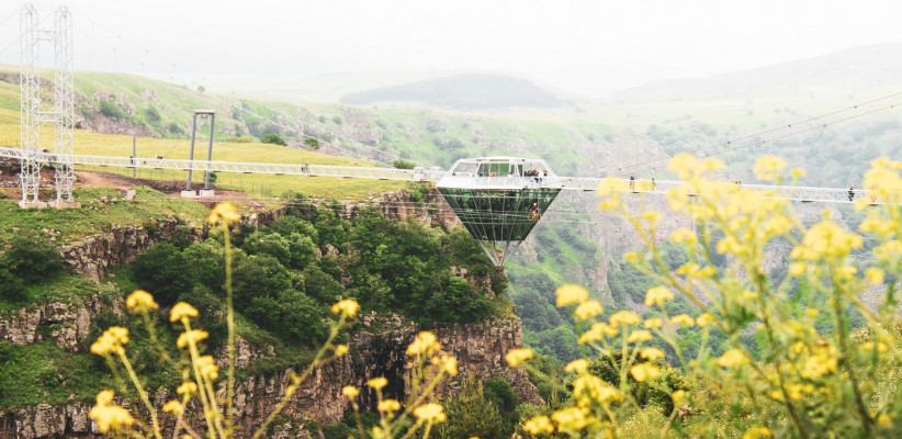 Панорамная смотровая площадка советского периода «Дружба Народов», откуда открывается вид на глубокое ущелье Кавказского хребта. Доступен полет на параплане над ущельем.