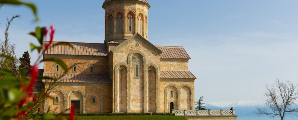 Посещение женского монастыря святой Нино Бодбе. С его территории открывается чарующий вид на Алазанскую долину и заснеженные вершины Кавказских гор.