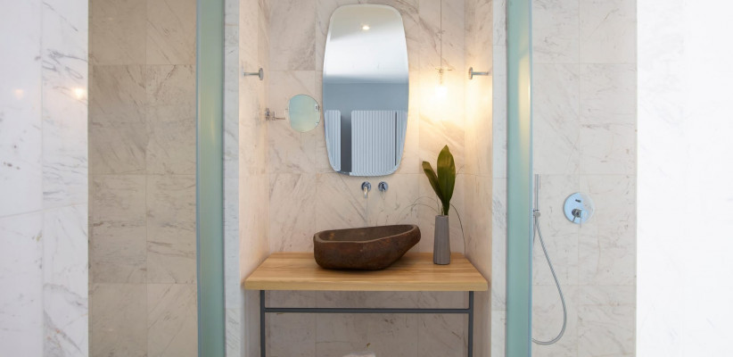 90 м2, терраса 115 м2 с двумя подогреваемыми бассейнами и панорамным видом на море и горы, две кровати king-size в двух спальнях, две ванные комнаты, гостиная с двумя диванами-кроватями, гардеробные, зона барбекю с кухней. Максимальное количество гостей: 4.