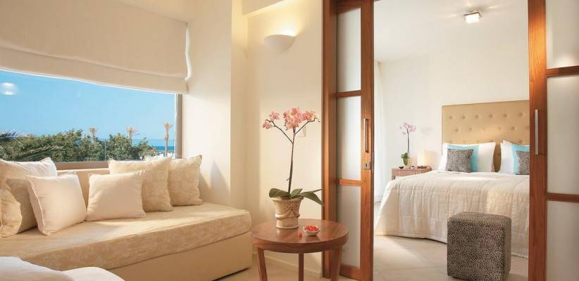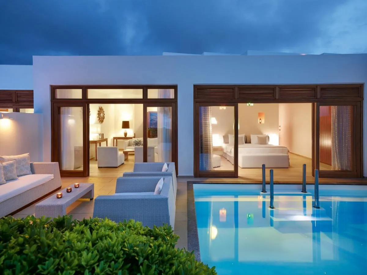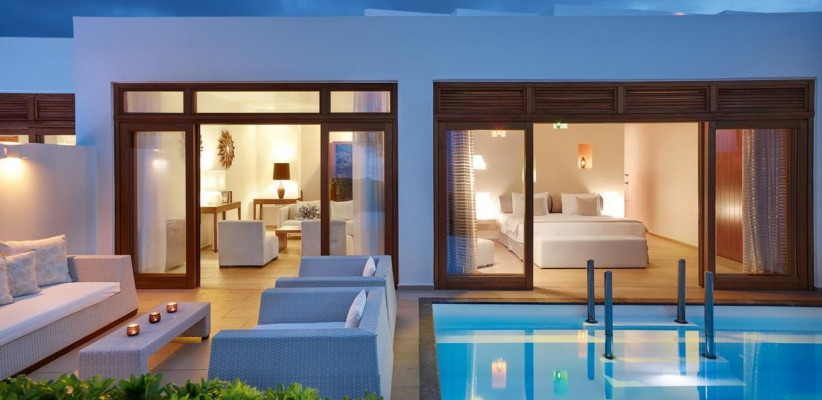 61 м2, открытое пространство площадью 30 м2, вид на море. Одна кровать king-size и одна дополнительная кровать, одна ванная комната, подогреваемый частный инфинити-бассейн площадью 17–18 м2, тренажерный зал с тренажерами. Максимальное количество гостей: 2 взрослых и 1 ребенок.Amirandes VIP Two Bedroom Suite