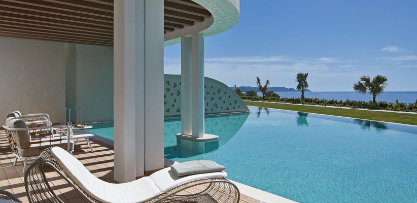 48 м2, терраса с частным бассейном, джакузи и видом на море, кровать king-size и диван-кровать, две ванные комнаты, гостиная. Максимальное количество гостей: 4.