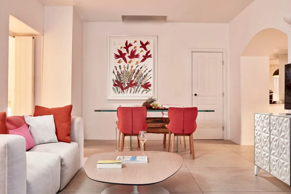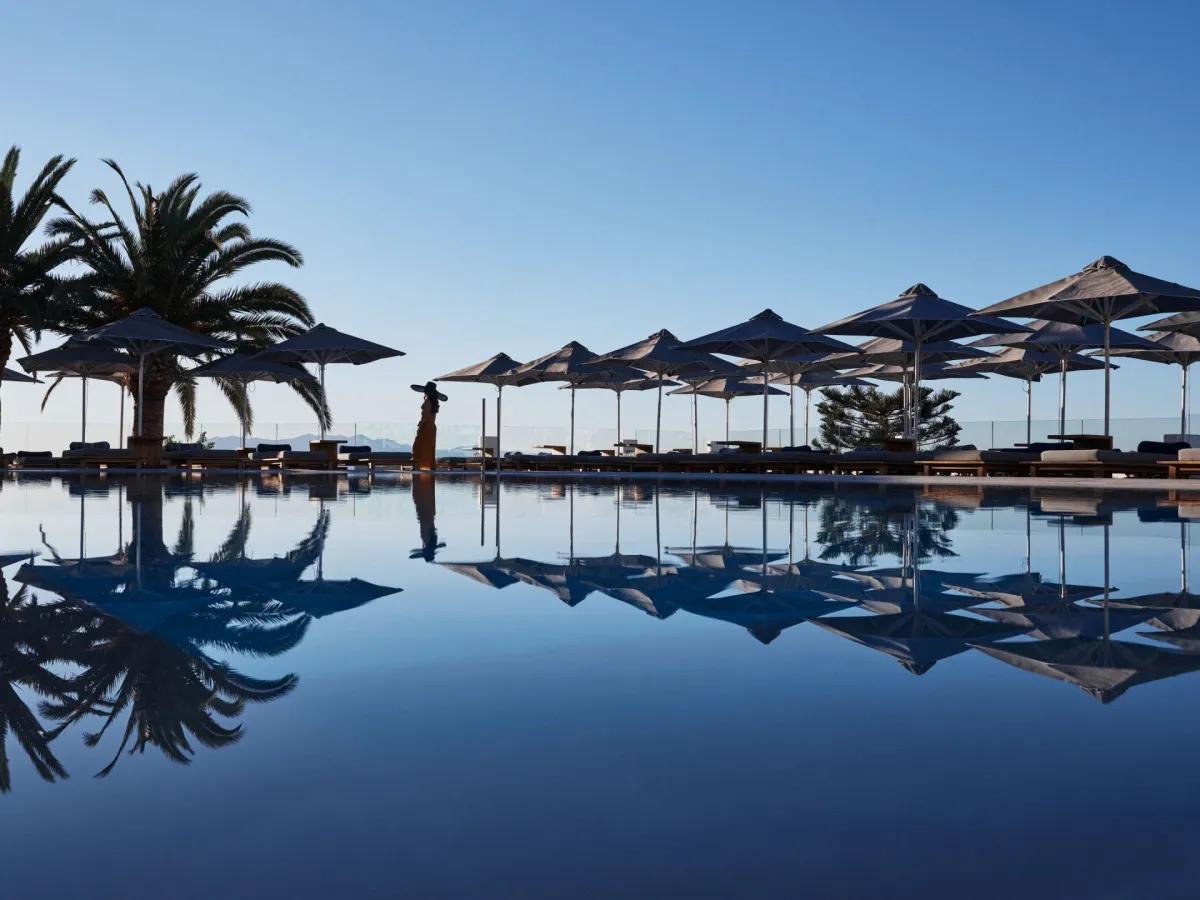 45 м2, люкс с одной кроватью king-size или двумя односпальными кроватями, диваном-кроватью, ванной комнатой с ванной и душем. Доступно несколько вариантов люксов: с террасой и общим бассейном, с террасой и собственным бассейном, с балконом или террасой с видом на море и зоной отдыха. Максимальное количество гостей: 3 взрослых.Azure Suite