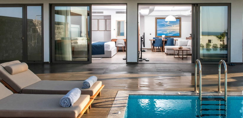 45 м2, терраса площадью 20 м2 и бассейн 21 м2. Люкс с видом на море и частным подогреваемым бассейном, с кроватью king-size и диваном-кроватью, меблированной террасой с шезлонгами и зоной отдыха. Максимальное количество гостей: 3 взрослых или 2 взрослых и 1 ребенок.Premium Energy Suite