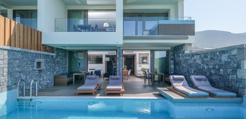75–82 м2, терраса площадью 35–48 м2 и бассейн 20–34 м2. Люкс с видом на море, с частным подогреваемым бассейном и фитнес-залом, с кроватью king-size и диваном-кроватью, меблированной террасой с шезлонгами и обеденной зоной. Максимальное количество гостей: 3 взрослых или 2 взрослых и 1 ребенок.Supreme Suite Sea View