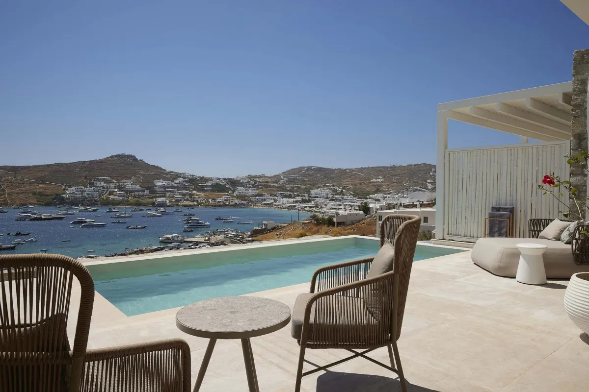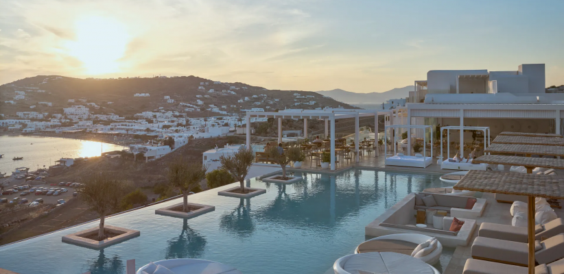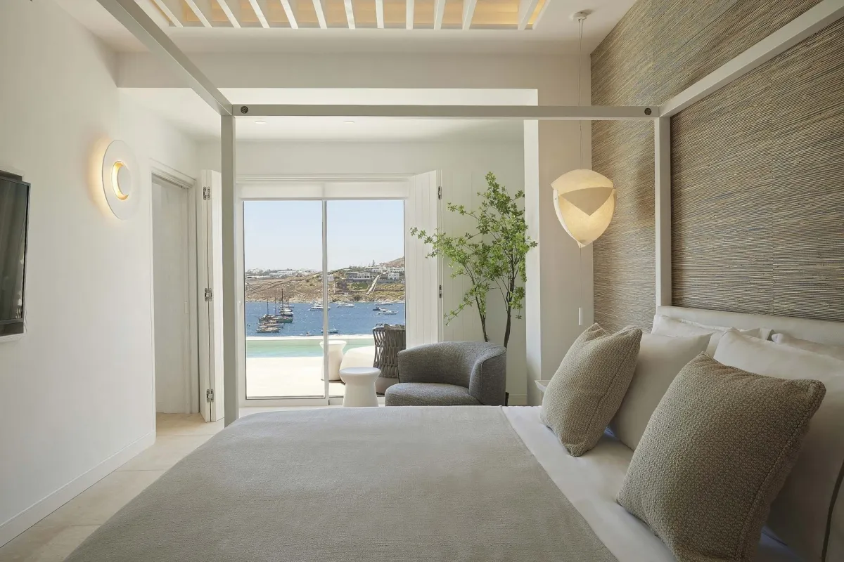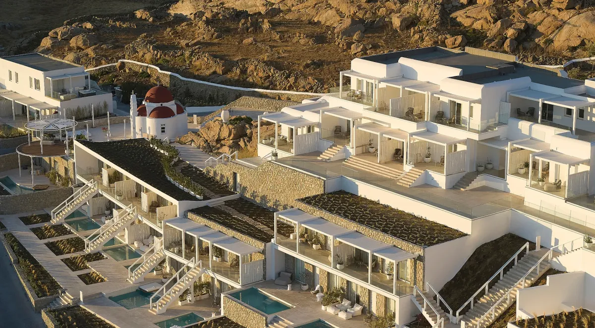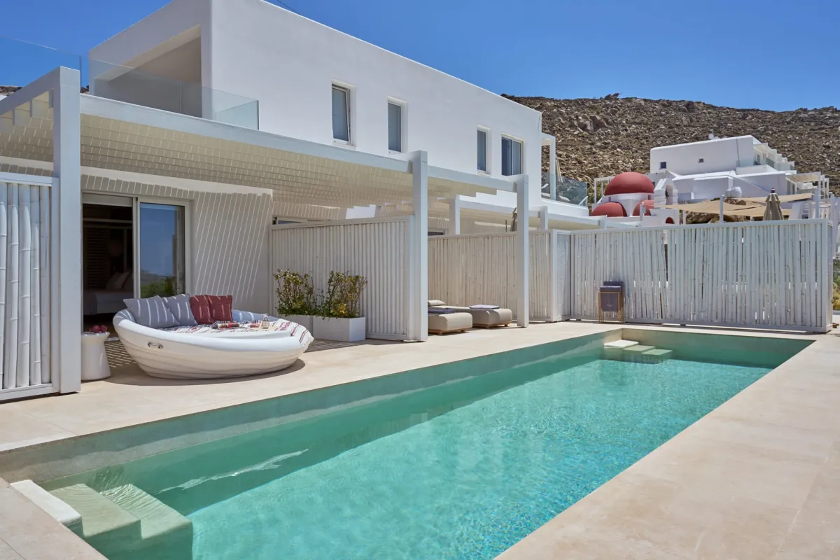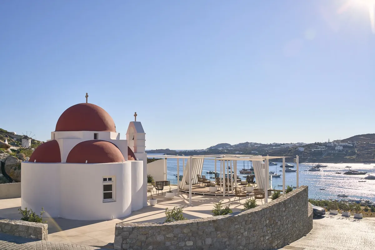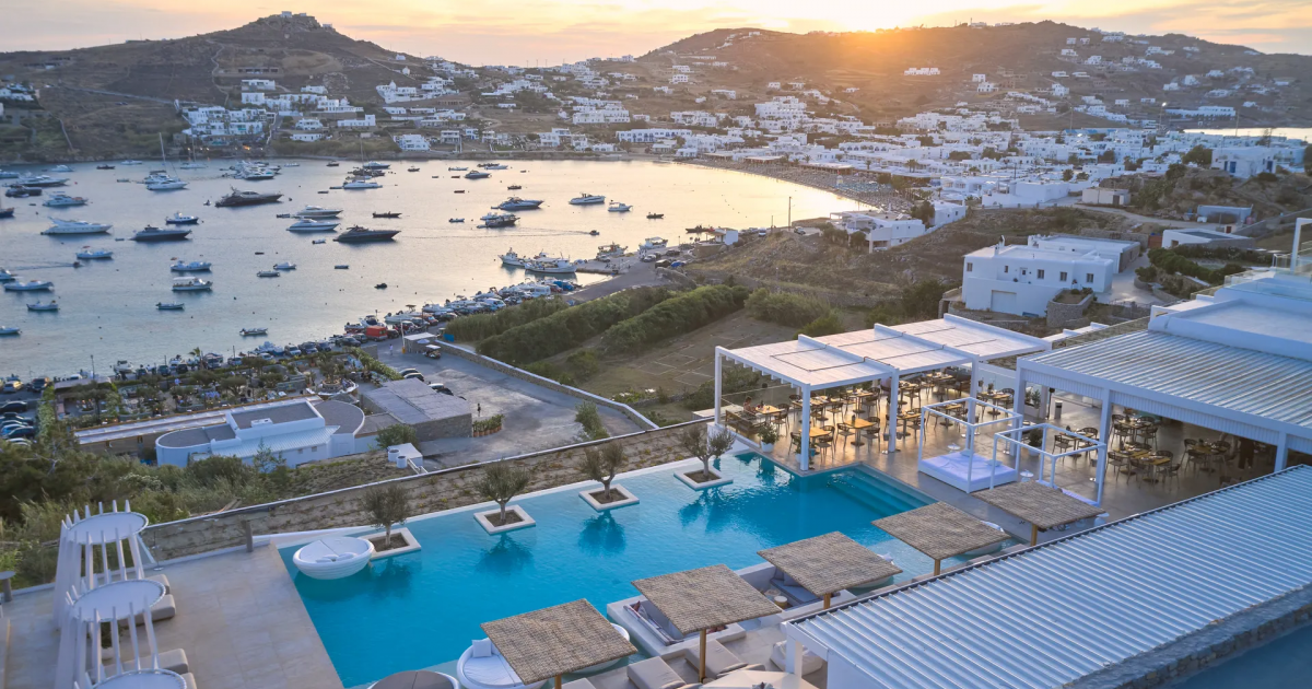 Отель Once in Mykonos Luxury Resort Adults Only, расположенный прямо над величественным пляжем Орнос, воплощает дух культового курорта Миконос в Греции.