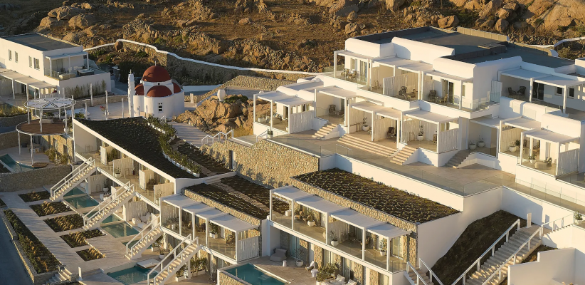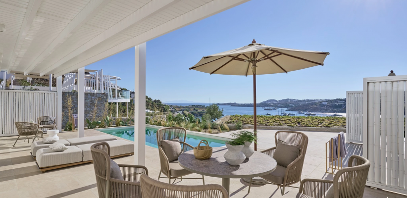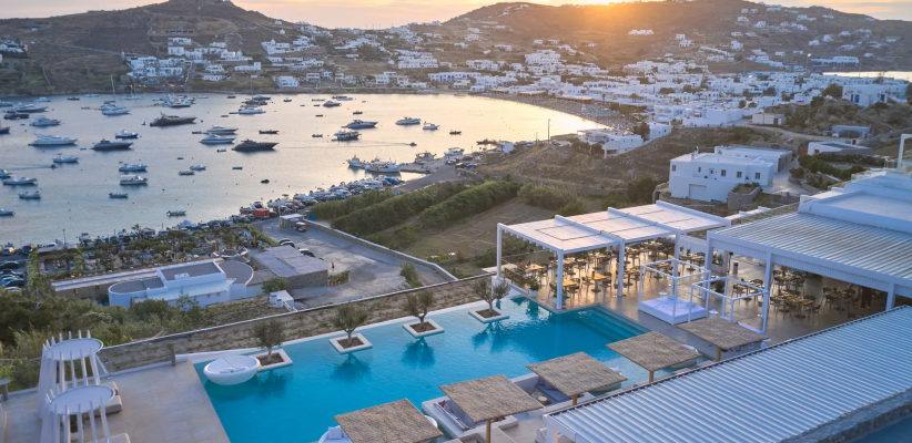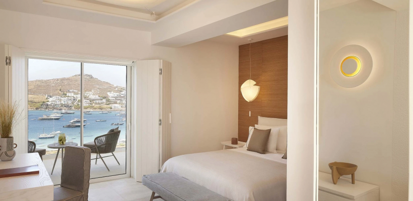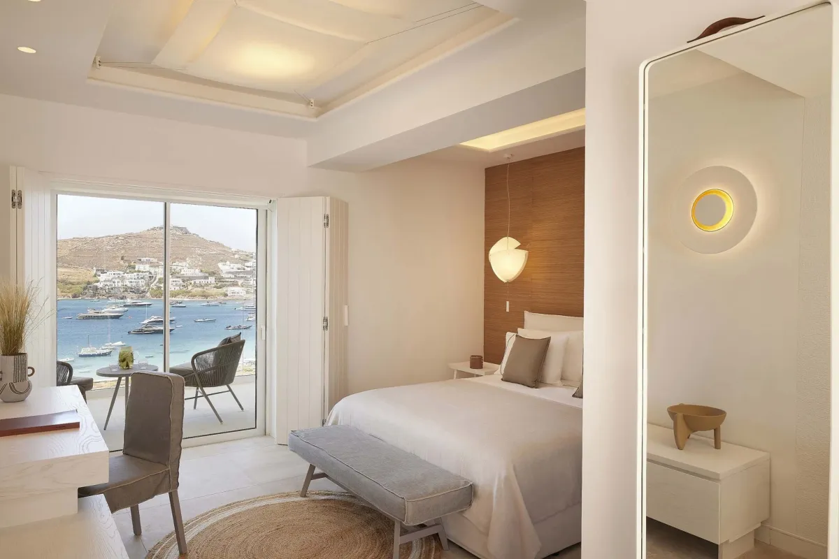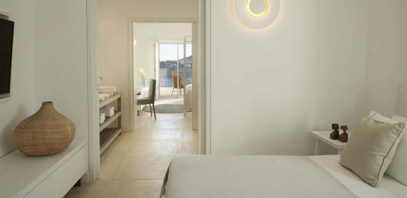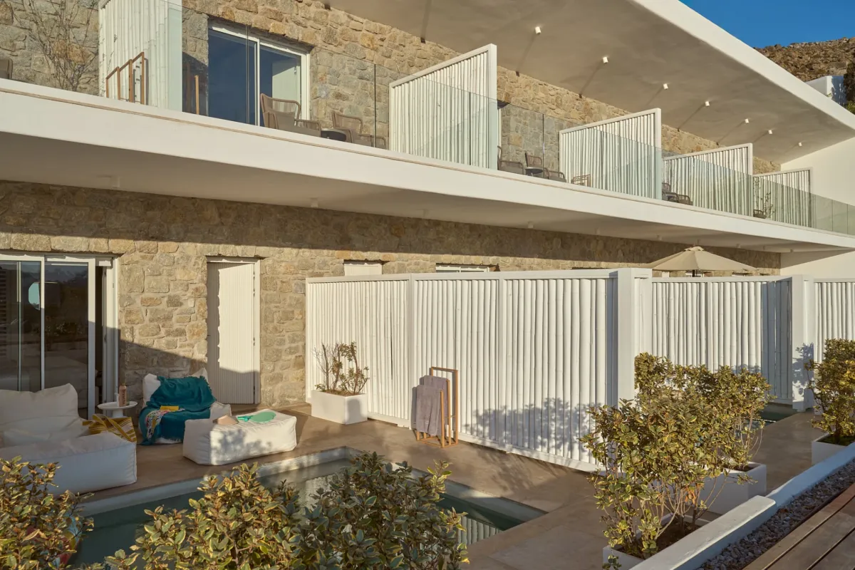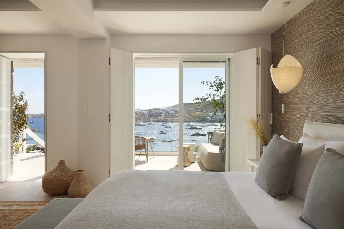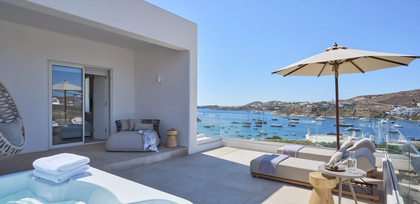 Отель Once in Mykonos Luxury Resort Adults Only, расположенный прямо над величественным пляжем Орнос, воплощает дух культового курорта Миконос в Греции.