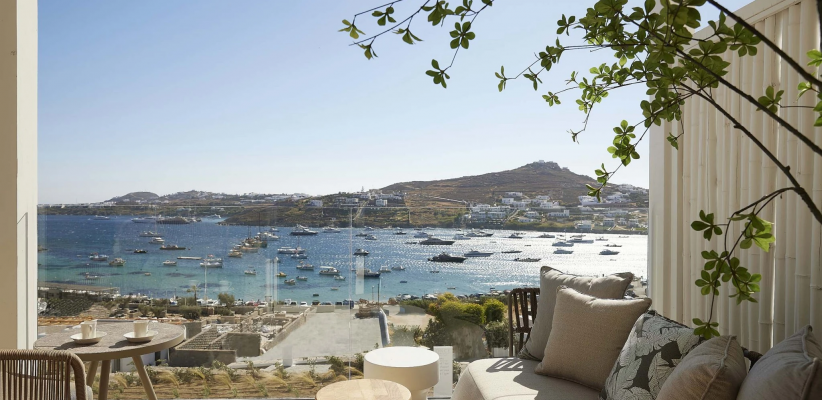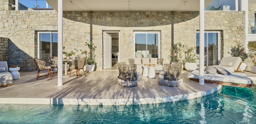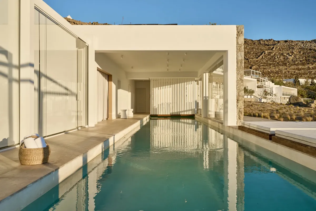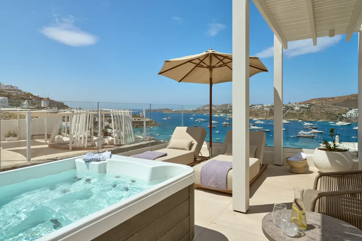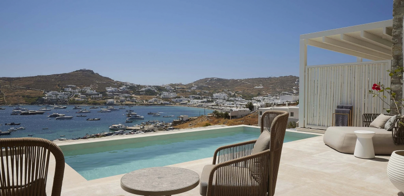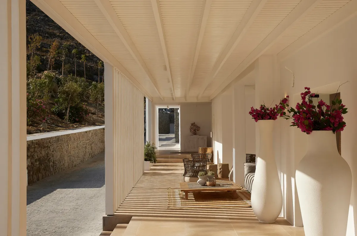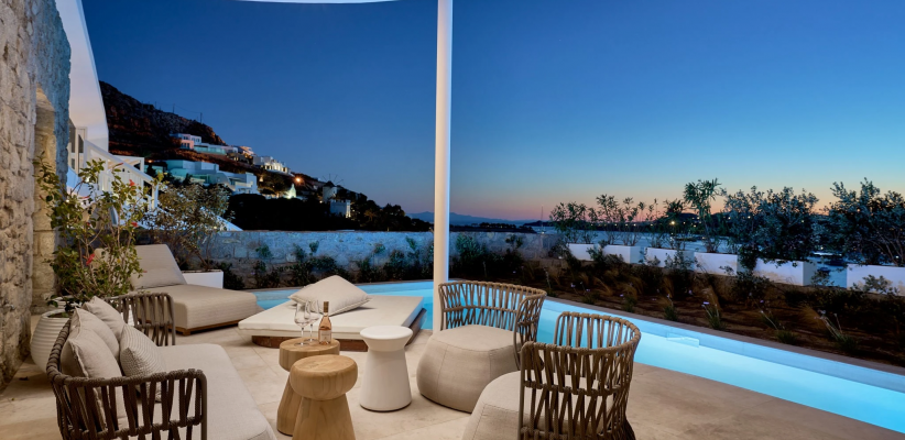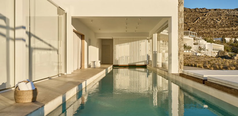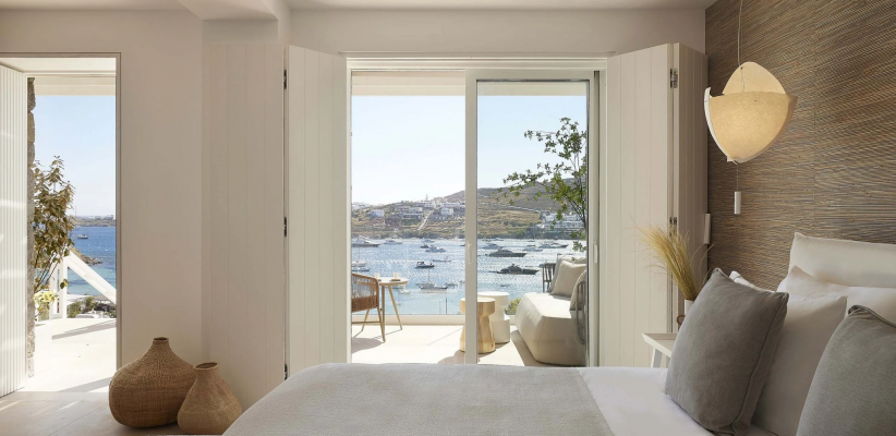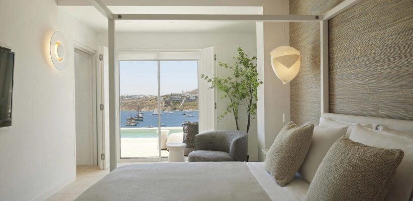 Отель Once in Mykonos Luxury Resort Adults Only, расположенный прямо над величественным пляжем Орнос, воплощает дух культового курорта Миконос в Греции.