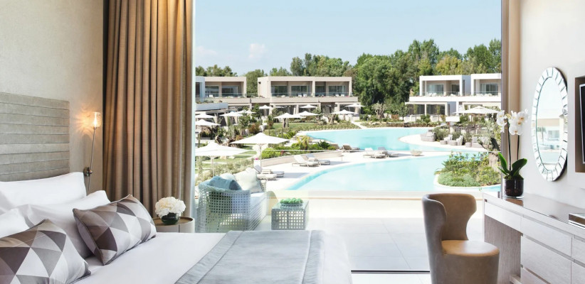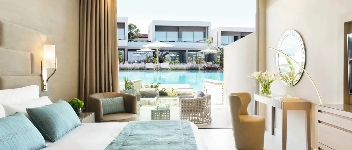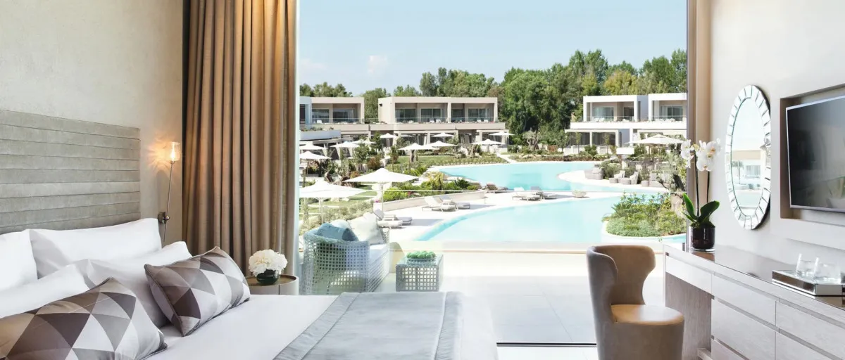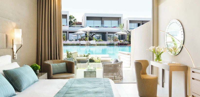 В Sani Dunes предлагается 146 номеров и люксов, от стандартных комнат до просторных семейных и люксов. Номера оформлены в современном стиле, многие имеют балконы или террасы с видом на бассейн или море. Есть варианты для пар, семей с детьми, большие люксы с одной или несколькими спальнями.