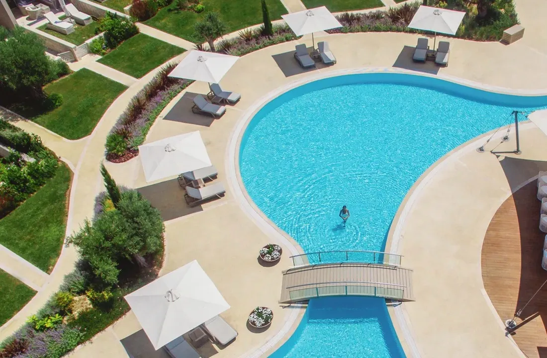 Главной гордостью отеля является огромный подогреваемый бассейн-лагуна площадью около 3500 м2, а также собственный белоснежный пляж с удобным входом в море. Территория окружена сосновым лесом, что создает гармоничное сочетание пляжного и природного отдыха.
