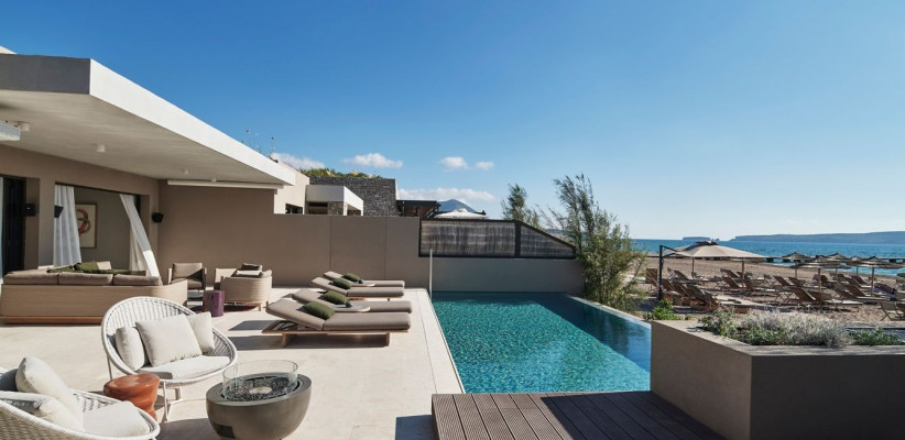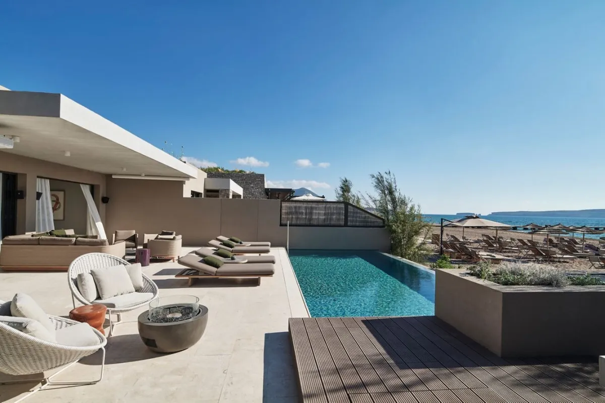 Отель W Costa Navarino располагает собственным пляжем с белоснежным песком и чистой лагуной, идеально подходящей для купания и спокойного отдыха на солнце.