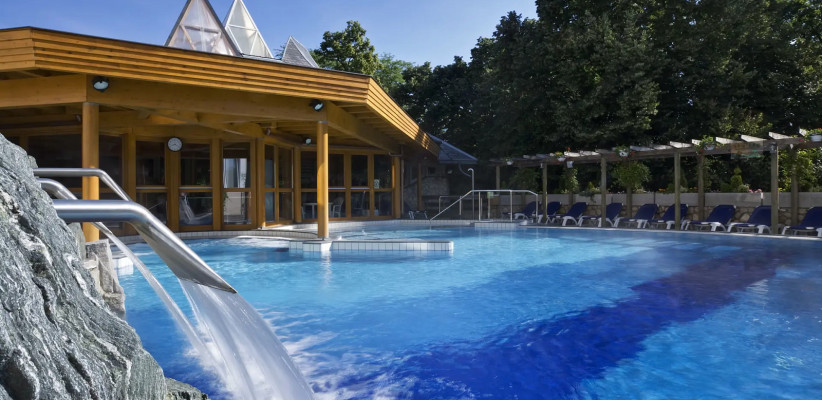 - термальная зона для гостей с 14 лет: крытая термальная купальня с двумя бассейнами (32-34°C и 36-38°C), открытый термальный бассейн с солнечной террасой (с мая по конец сентября)
