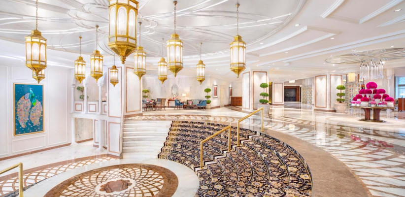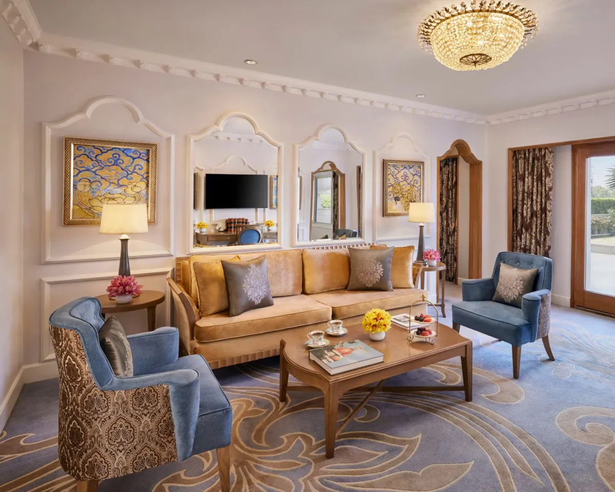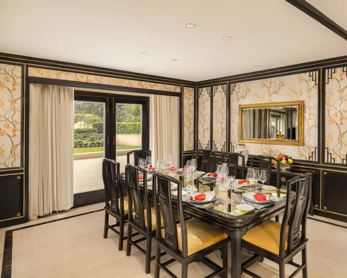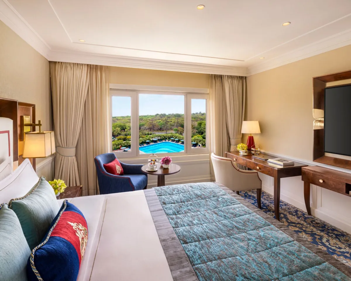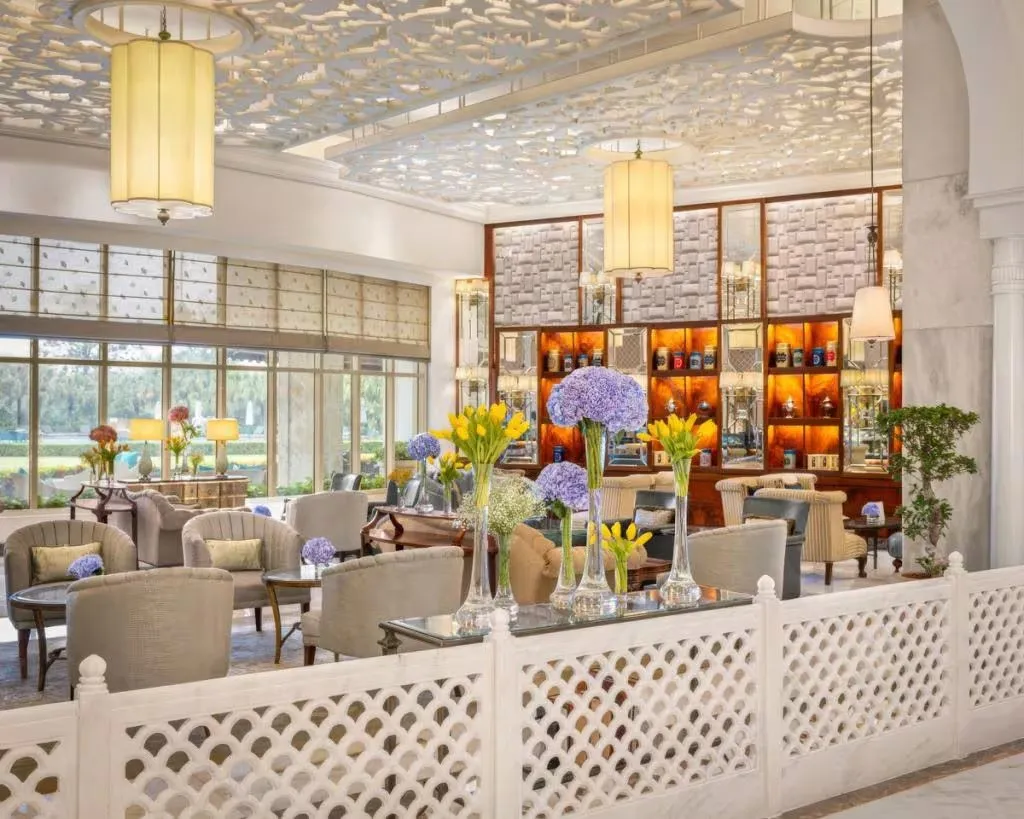 Taj Palace, New Delhi – единственный в столице отель-дворец, открытый в 1983 году и расположенный рядом с аэропортом, посольствами и деловым районом. Здание в форме бумеранга утопает в шести акрах зелени, сочетая современный дизайн с элементами индийского искусства. Электронная система фильтрации обеспечивает чистейший воздух, а просторный вестибюль с люстрами и позолотой задает атмосферу утонченной роскоши.