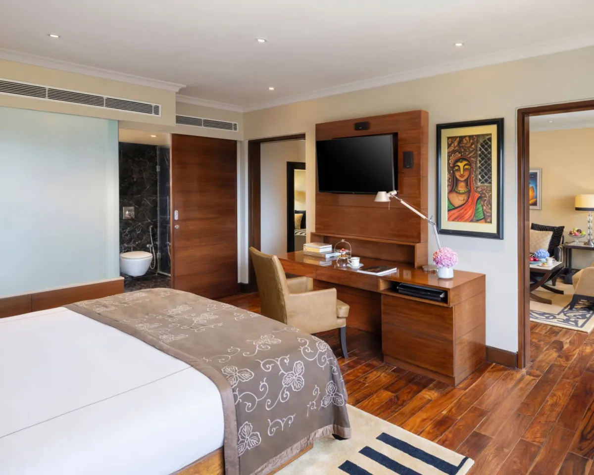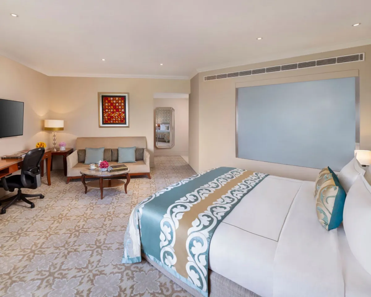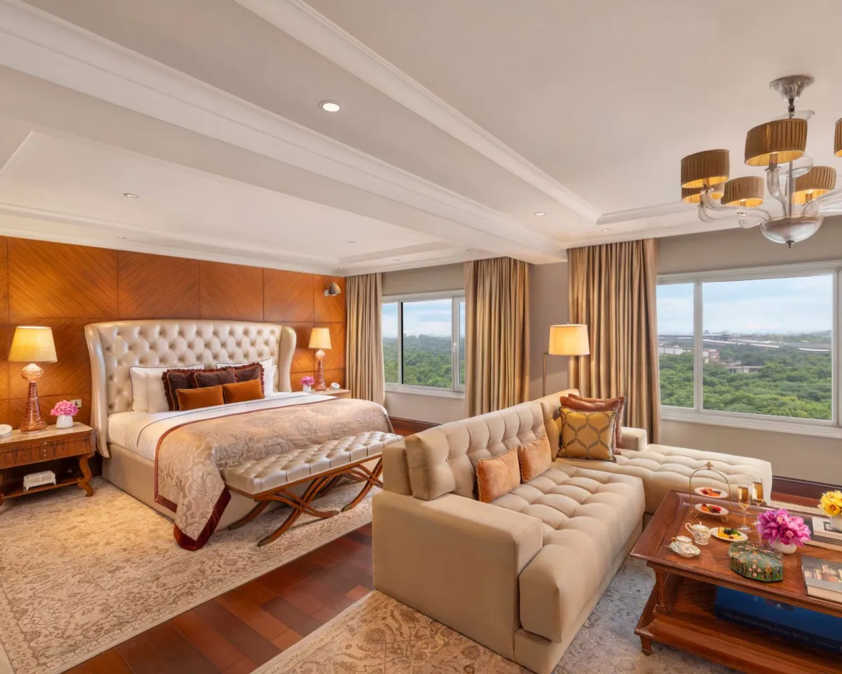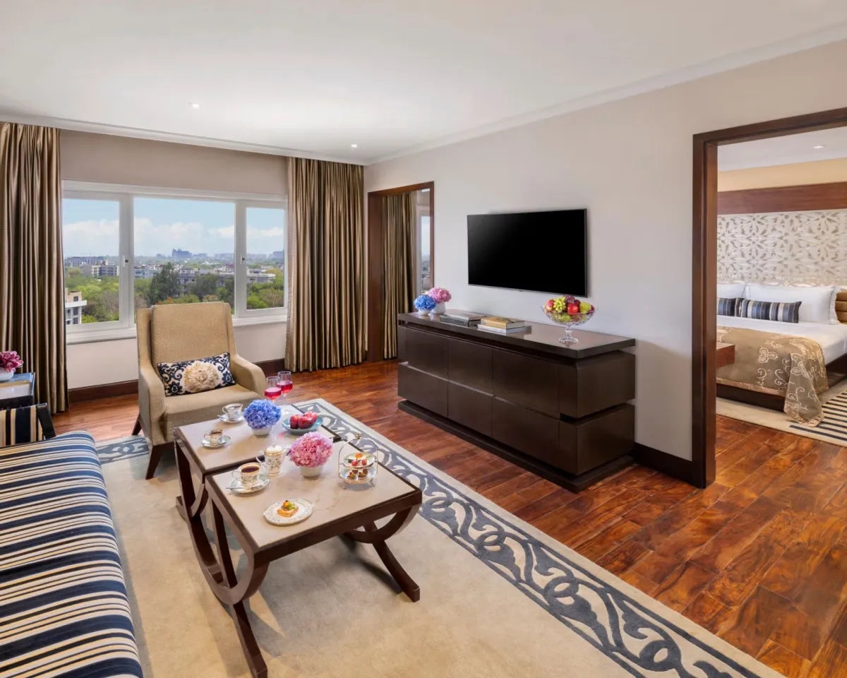 45 м2, кровать размера «king-size», гостиная зона, особое клубное обслуживание, панорамный вид на город. Количество гостей: 3Taj Club Suite King Bed Diplomatic Enclave View