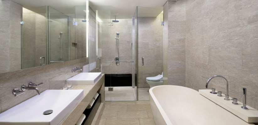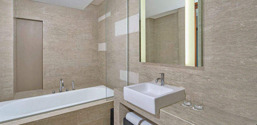 - Просторные номера с качественным оснащением: удобные кровати, рабочие зоны, мраморные ванные комнаты.