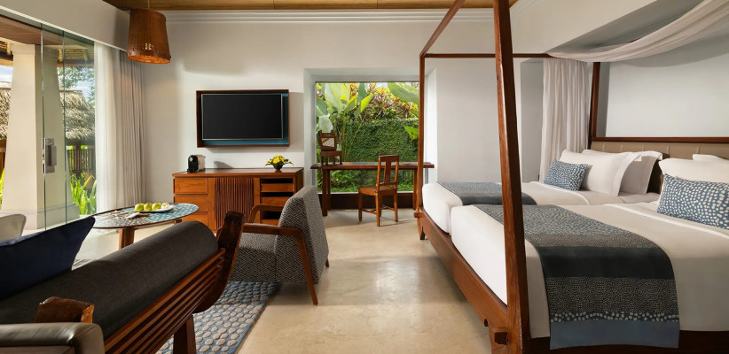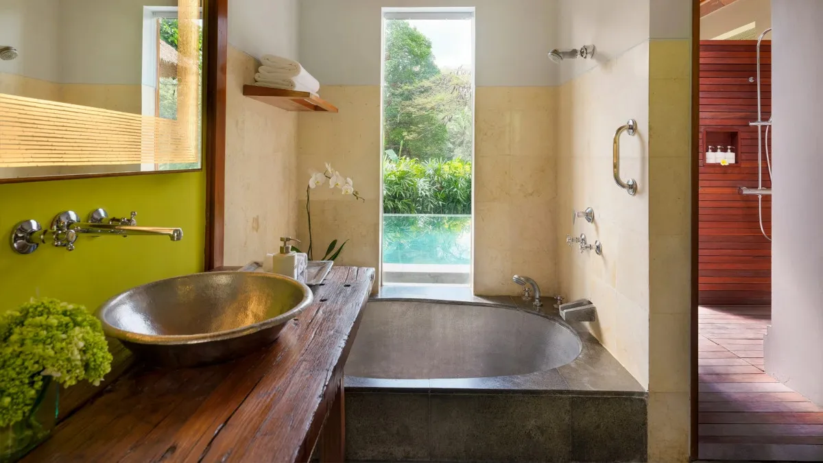 360 м2, вилла с террасой, балийским садом, бассейном, тропическим душем на открытом воздухе, одной кроватью king-size или двумя односпальными кроватями, ванной комнатой с ванной. Доступны смежные виллы. Доступно размещение дополнительной кровати за отдельную плату. Максимальное количество гостей: 4 взрослых.Heavenly Two Bedroom Pool Villa – райская вилла с двумя спальнями и бассейном