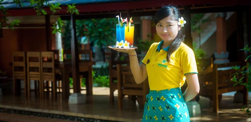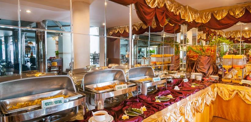 Ресторан отеля, где подают блюда местной, азиатской и интернациональной кухни, работает круглосуточно. По вечерам гостей ресторана развлекают живой музыкой. Раз в неделю проходит выступление балийских танцоров. Закуски и напитки подаются в баре у бассейна.