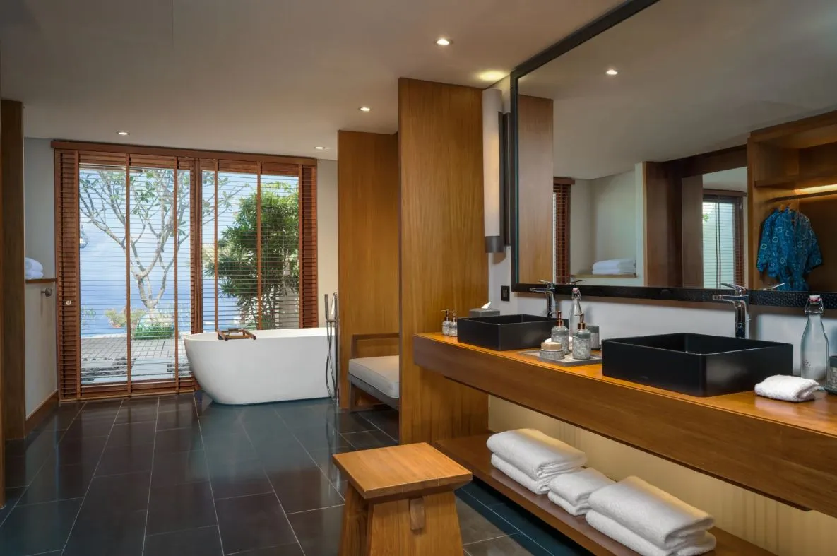 350 м2, вилла с видом на океан и бассейном. В номере: две спальни с двуспальной и односпальными кроватями, гостиная, телевизор, диван, три ванные комнаты, обеденная зона, детский бассейн. Максимальное количество гостей: 5.Cliff Pool Villa – Three Bedroom