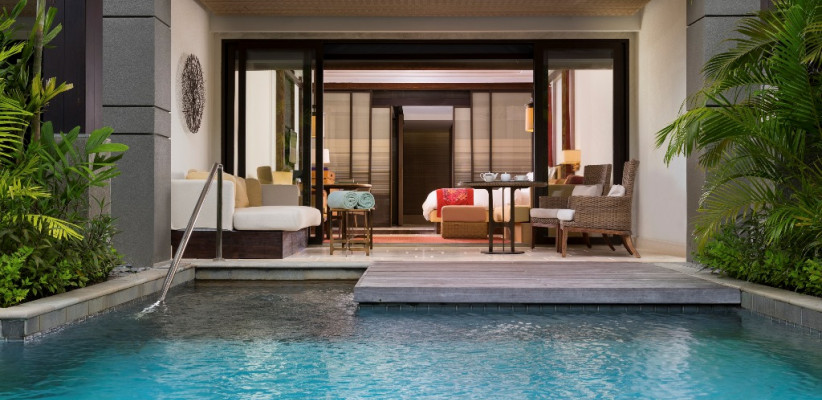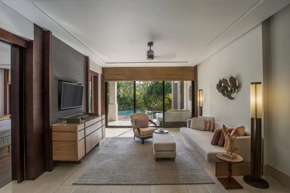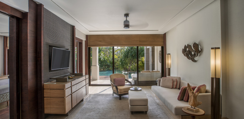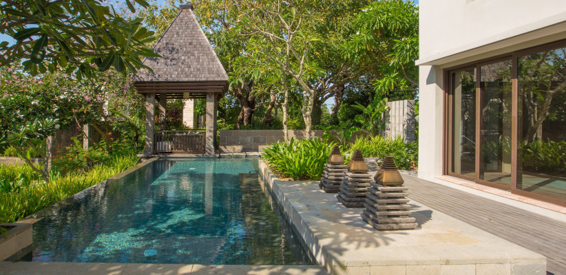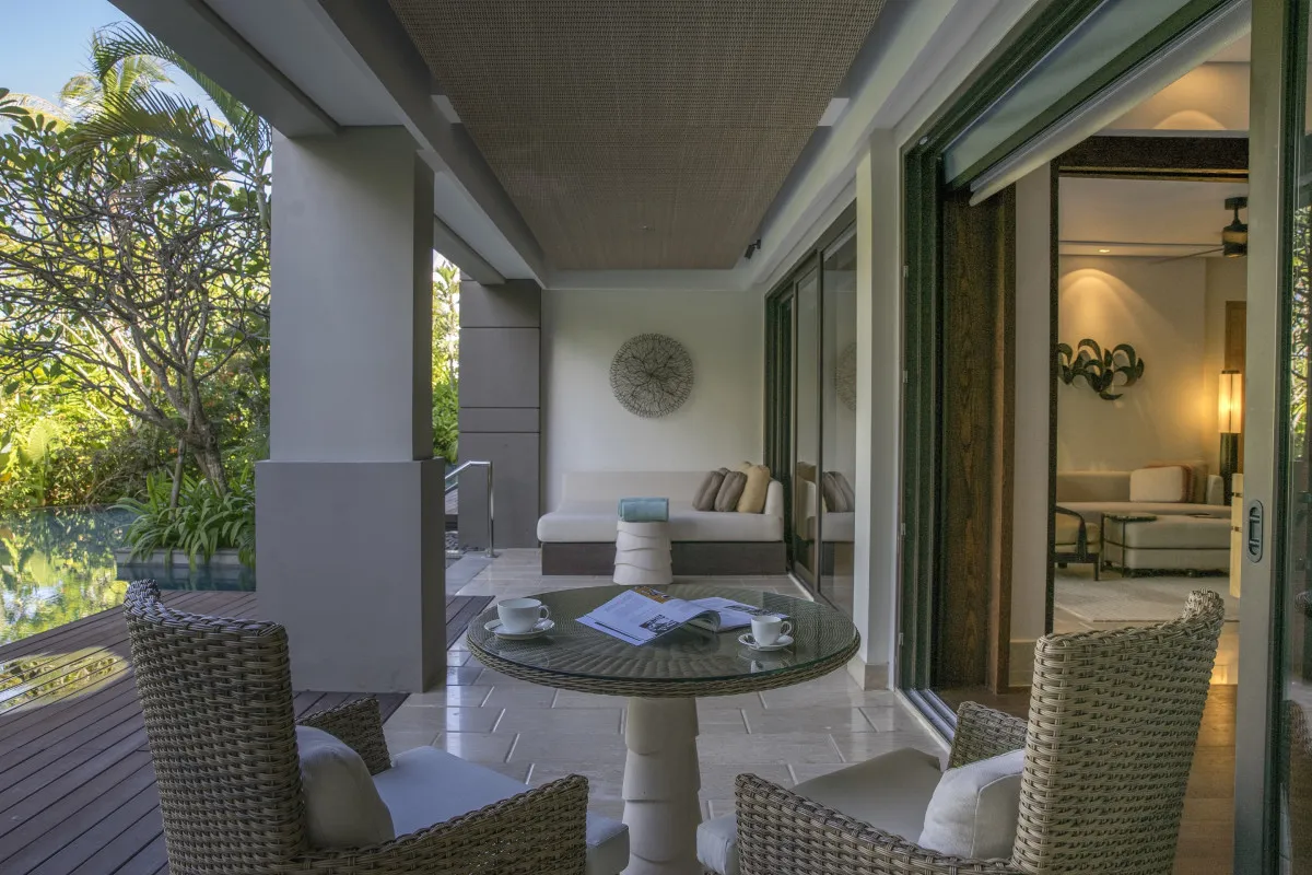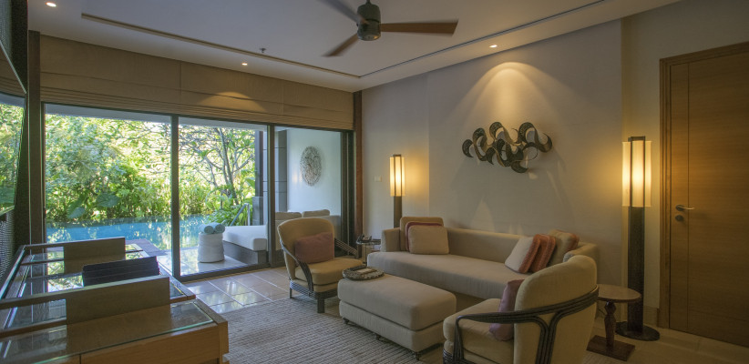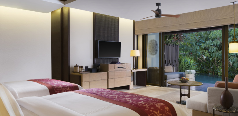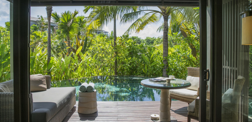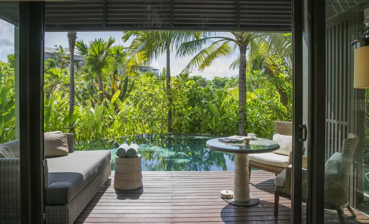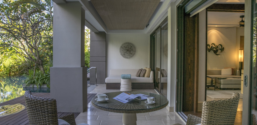120 м2, двуспальная кровать «super king-size» или две кровати «quenn-size», отдельная гостиная и столовая, патио, терраса с выходом к бассейнуGarden Villa with Private Pool (One Bedroom)