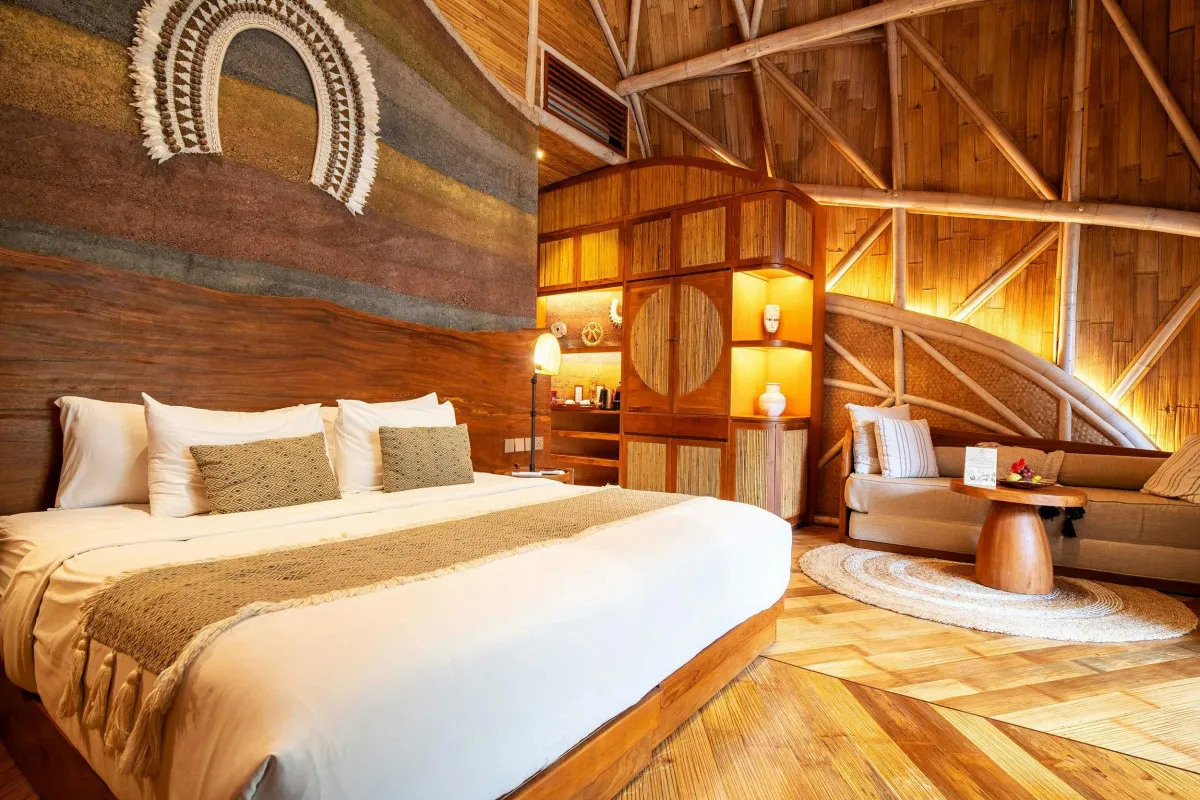 Номерной фонд отеля составляют 20 дизайнерских вилл, построенных из экологически чистых материалов.