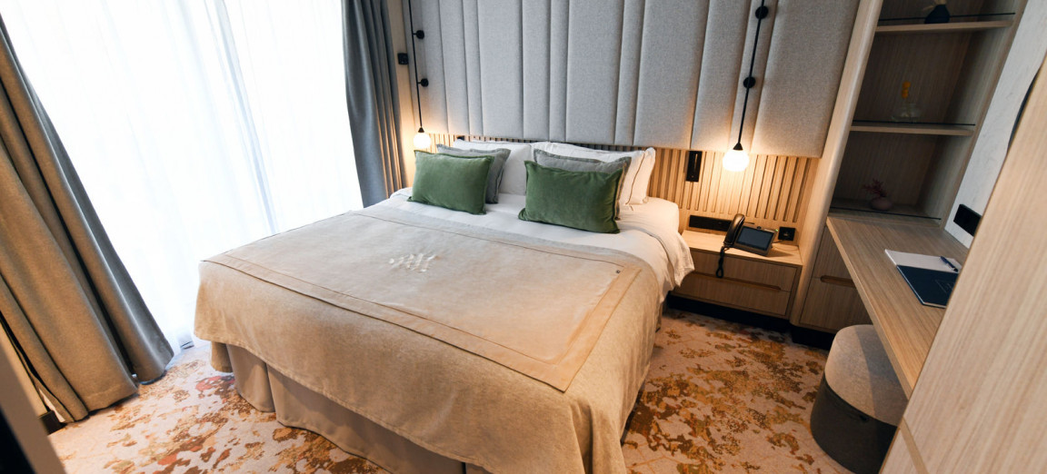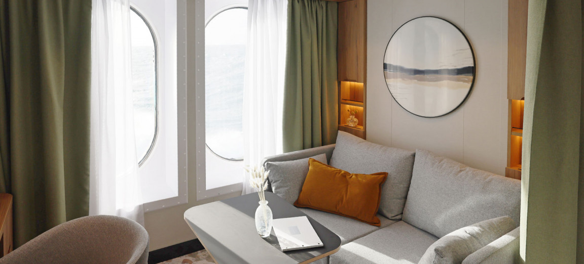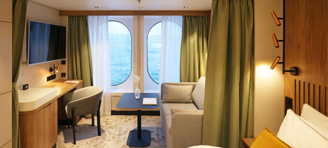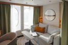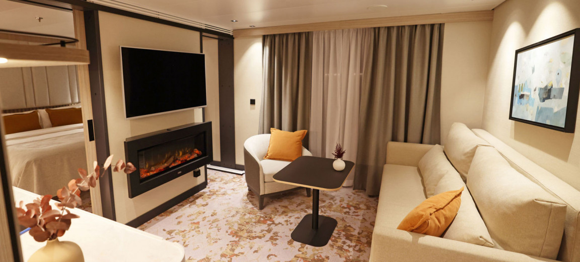 Сьют (40 м2, макс 4 чел, 5 и 6 палуба, в средней части судна): кровати размера king, голографический камин с эффектом живого пламени, отдельная гостиная с окном и балконом (межкомнатная дверь), креслом и кофейным столиком, душевая кабина и ванна.