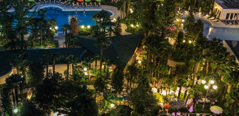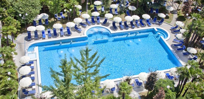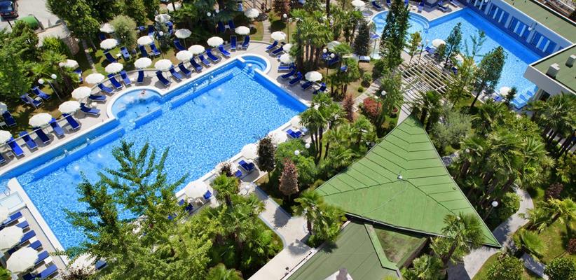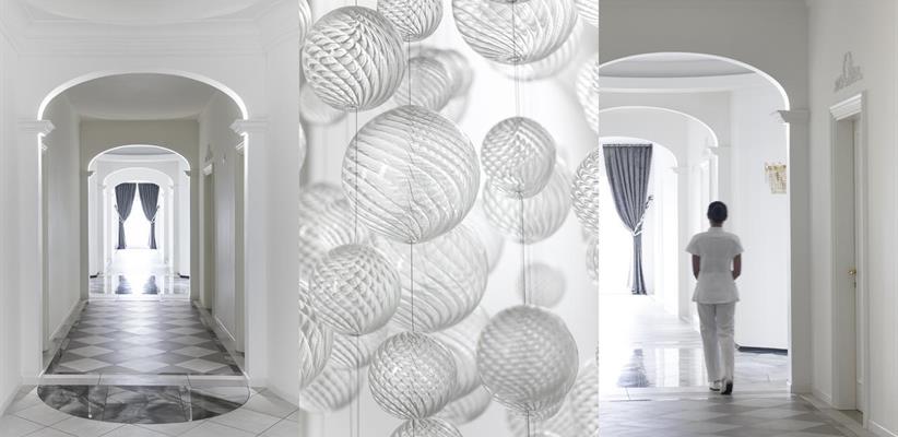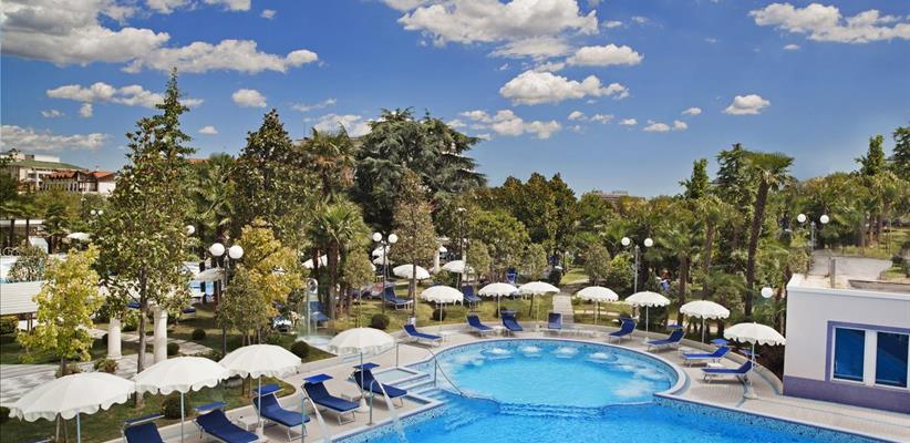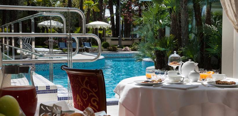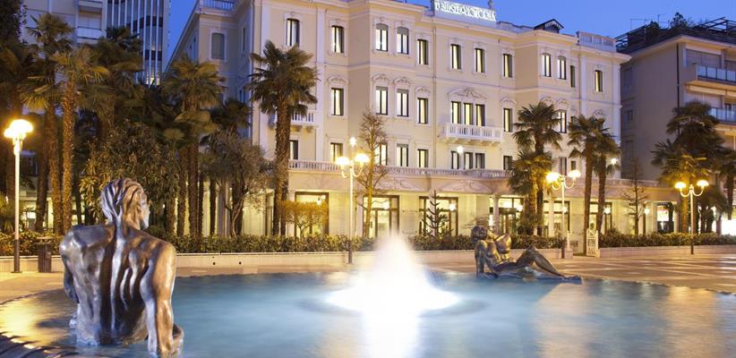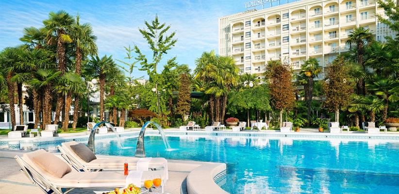 В Италии, неподалеку от Падуи, расположен небольшой, но очень известный курорт Абано-Терме, место, популярное благодаря обилию термальных источников. На одном из них и стоит Grand Hotel Terme Trieste & Victoria, построенный в 1912 году. Фасад главного корпуса выходит на улицу Абано. За высокими стеклянными дверями центрального входа сразу открывается просторный холл, из которого легко попасть на внутреннюю территорию с садом и тремя открытыми термальными бассейнами, один из которых объединен каналом с закрытым искусственным водоемом. В общественных помещениях гостиницы царит роскошь, воплощенная в колоннах, красивых светильниках, коврах и картинах.
